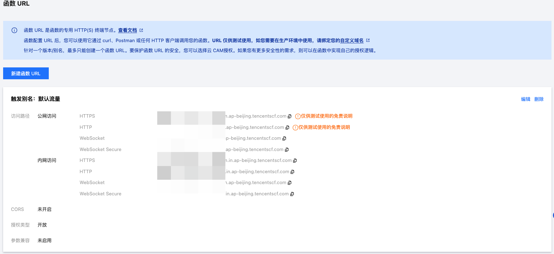 7. 函数创建后,可以在函数 URL 页查看到对应的 ws/wss 地址。如下图所示: