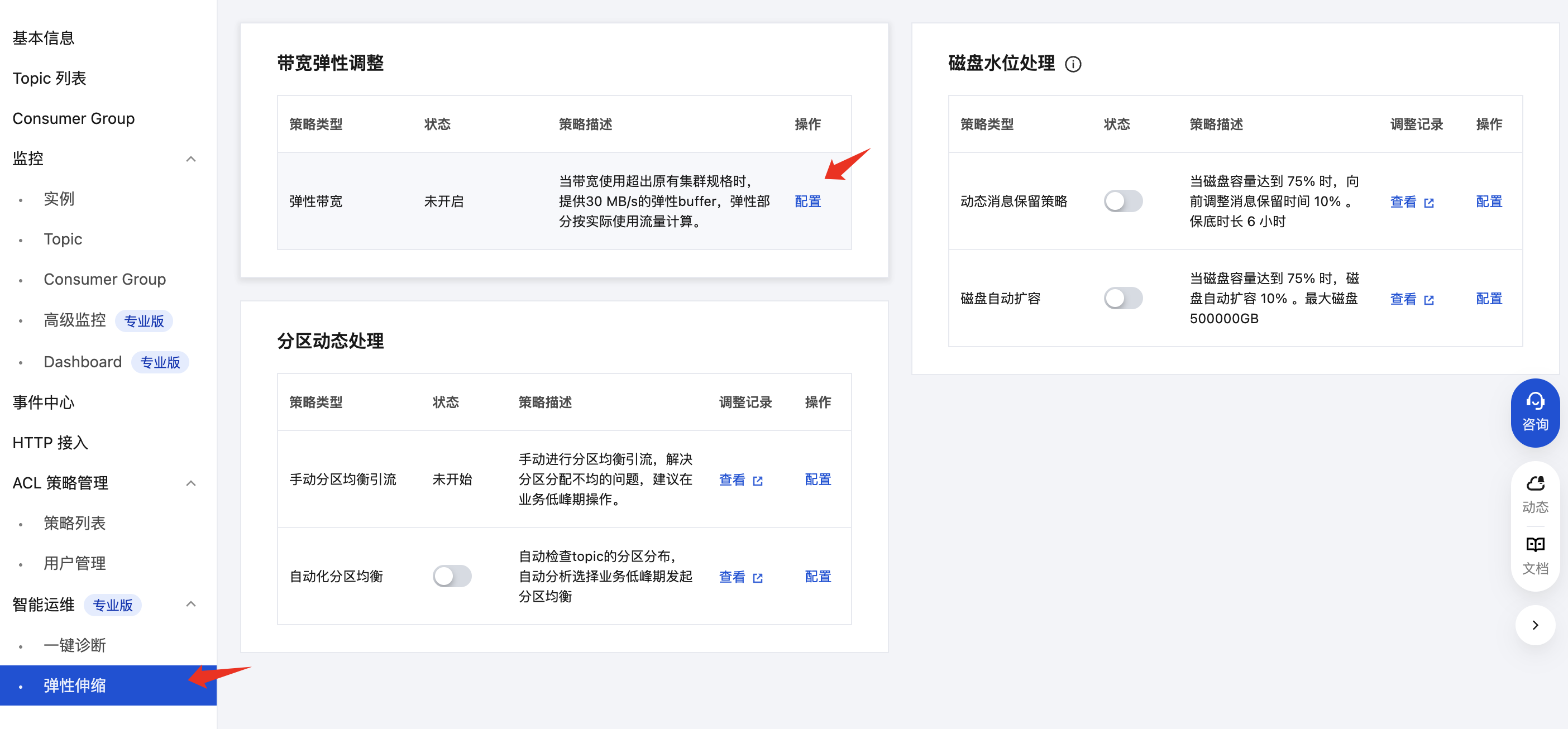 2. 在左侧栏选择智能运维 > 弹性伸缩页签,点击弹性带宽调整模块中操作栏的配置按钮,可以开启或者关闭弹性带宽。