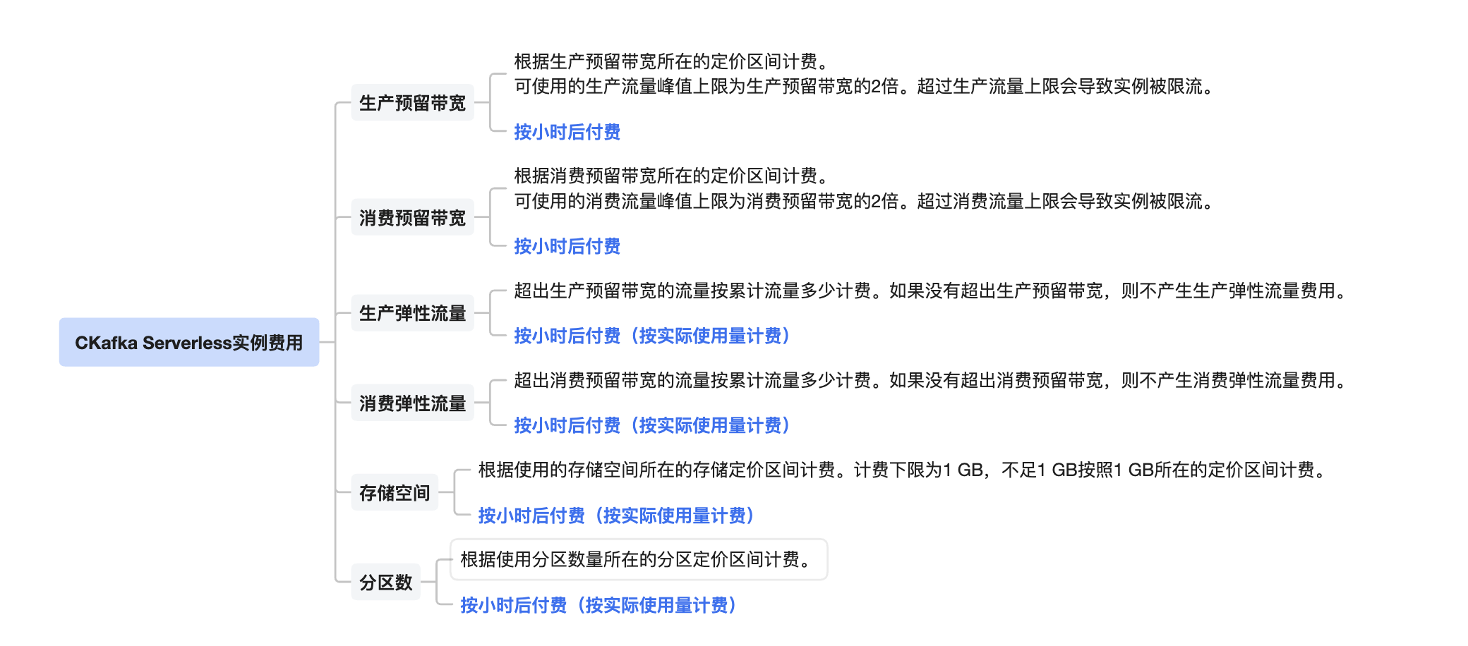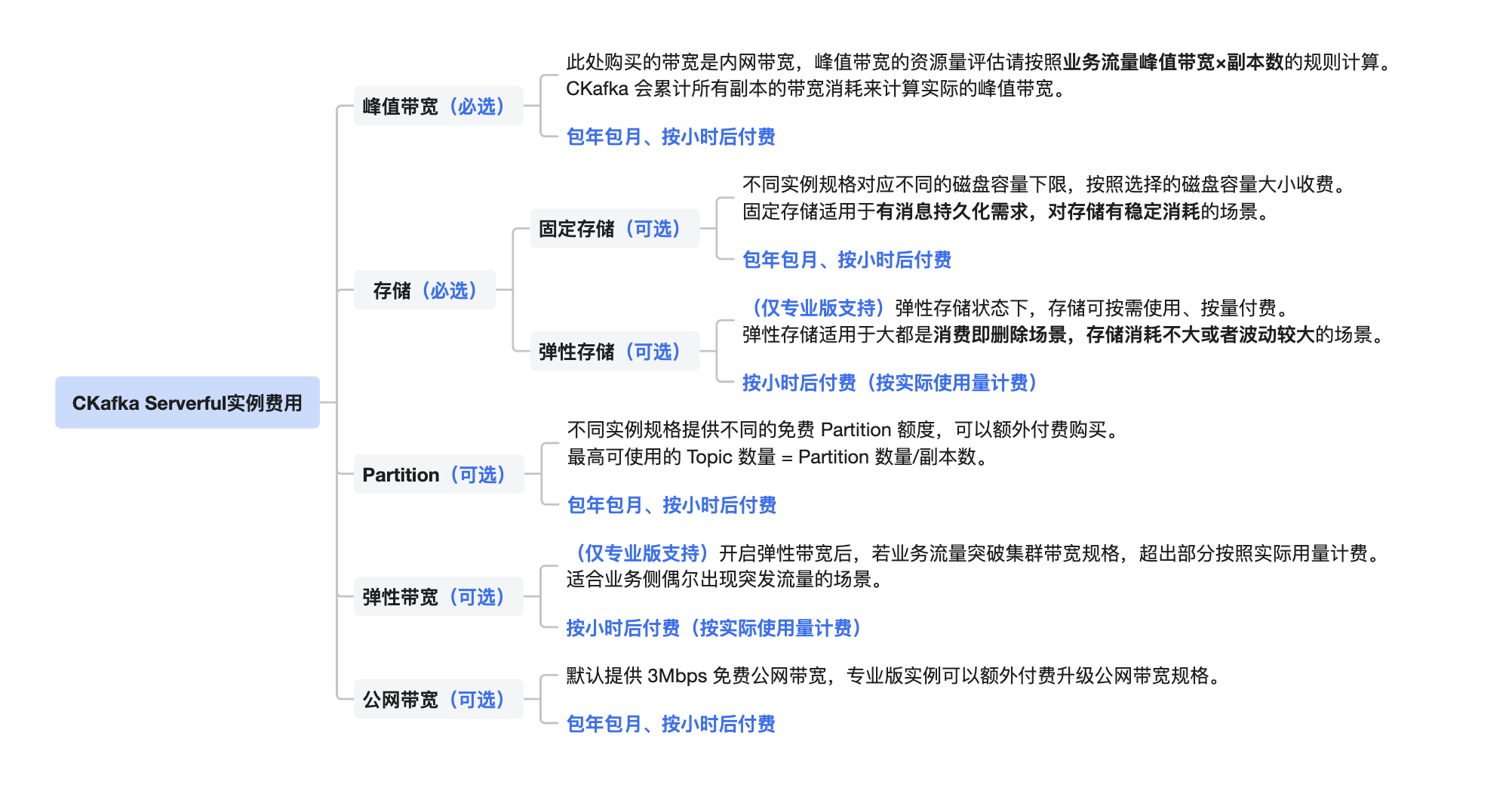 消息队列 CKafka Serverful 形态包年包月、按小时后付费等计费模式的计费项基本相同,以下为消息队列 CKafka Serverful 系列、Serverless 形态、连接器具体的计费项说明。