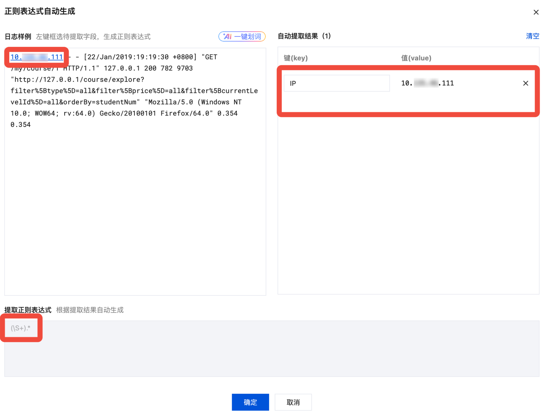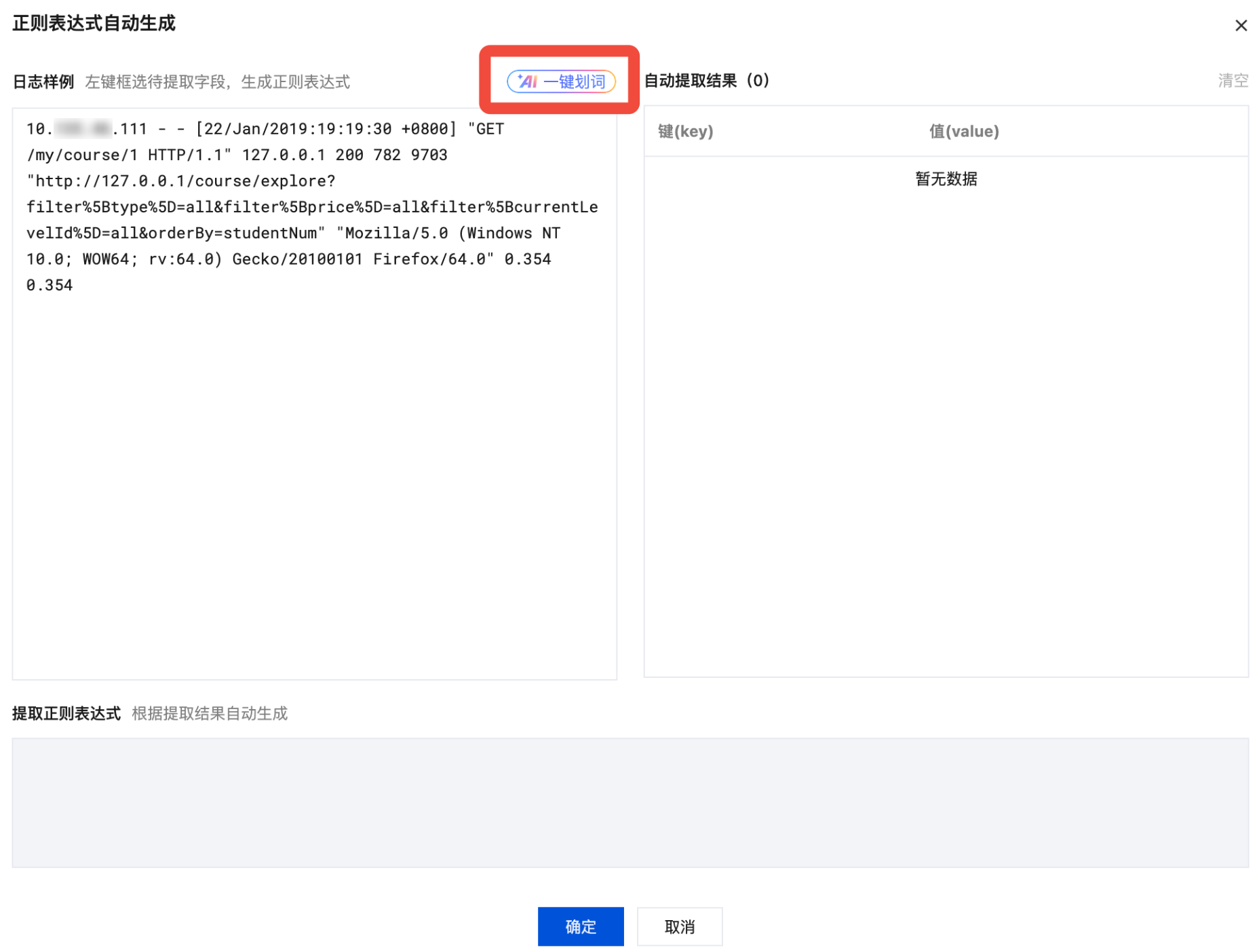 3. AI 将对您的日志进行智能划词,识别出对应的 key-value 结构,并根据值(value),自动生成键( key)。划词结果会在右侧的自动提取结果表格中展示,您可在此对键(key)进行修改。同时系统会根据划词结果自动生成提取正则表达式并显示在下侧表格中。如下图所示: