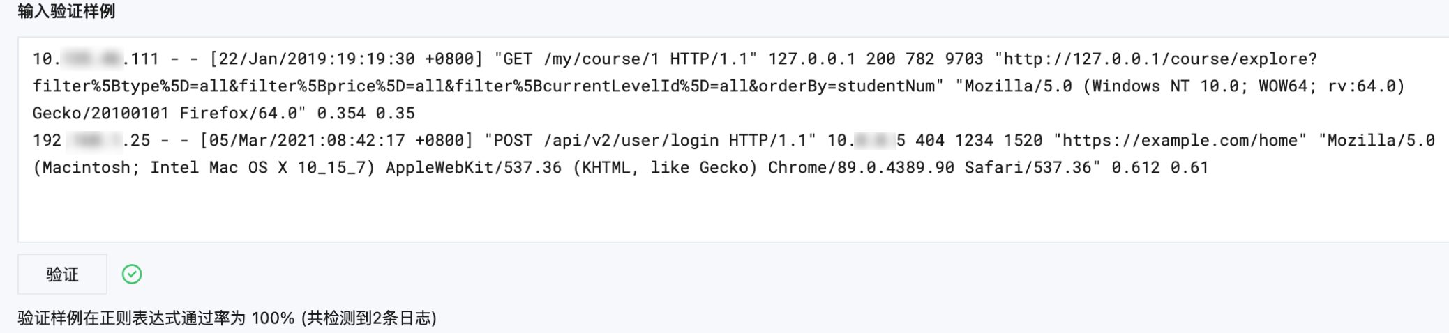 2. 输入待验证日志样例,以换行符分开多条数据,单击验证,系统将验证样通过率。出现