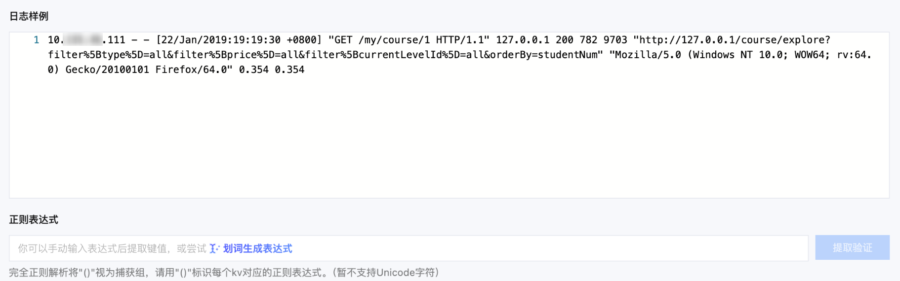 捕获组提取对应的 key-value 后,您可以自定义每组的 key 名称如下所示:body_bytes_sent: 9703http_host: 127.0.0.1http_protocol: HTTP/1.1http_referer: http://127.0.0.1/course/explore?filter%5Btype%5D=all&filter%5Bprice%5D=all&filter%5BcurrentLevelId%5D=all&orderBy=studentNumhttp_user_agent: Mozilla/5.0 (Windows NT 10.0; WOW64; rv:64.0) Gecko/20100101 Firefox/64.0remote_addr: 10.135.46.111request_length: 782request_method: GETrequest_time: 0.354request_url: /my/course/1status: 200time_local: [22/Jan/2019:19:19:30 +0800]upstream_response_time: 0.354