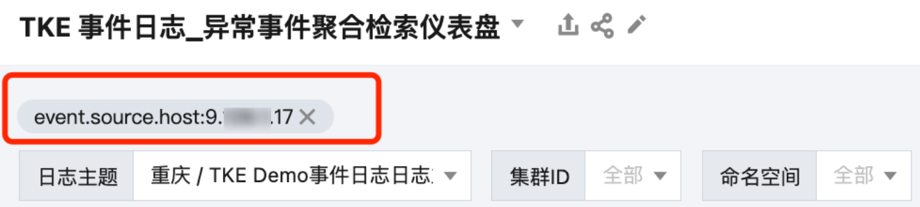 场景:查看“总览仪表盘”,定位出错误数最多的集群。然后携带该集群ID作为过滤条件,打开“异常事件聚合检索分析仪表盘”,查看详情。配置如下: