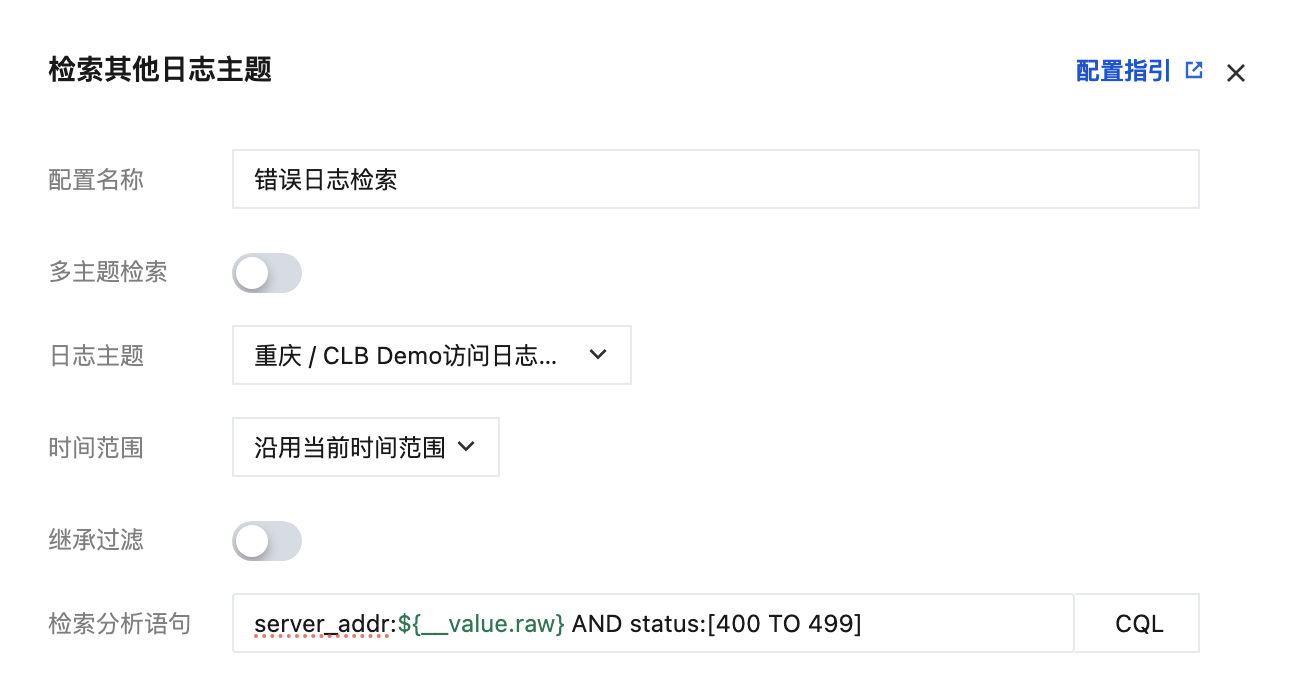 在图表中配置交互事件 > 检索其他日志主题,选择沿用当前日志主题,配置检索语句如下图: