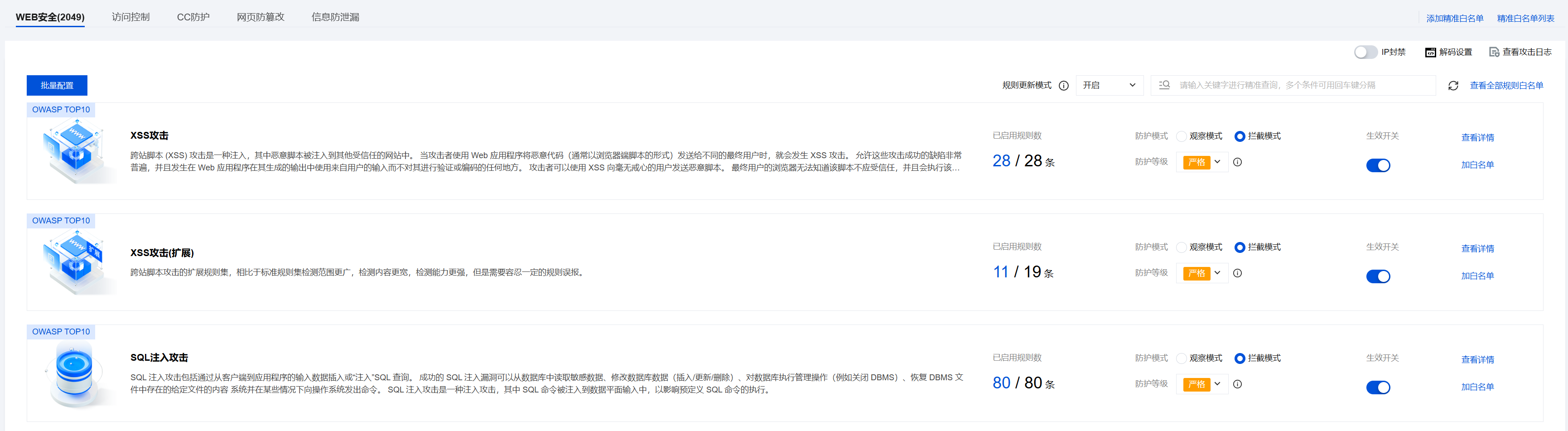 生效开关:支持用户一键配置特定攻击类型的规则集是否生效,适用于用户按需快速调整安全策略需求。