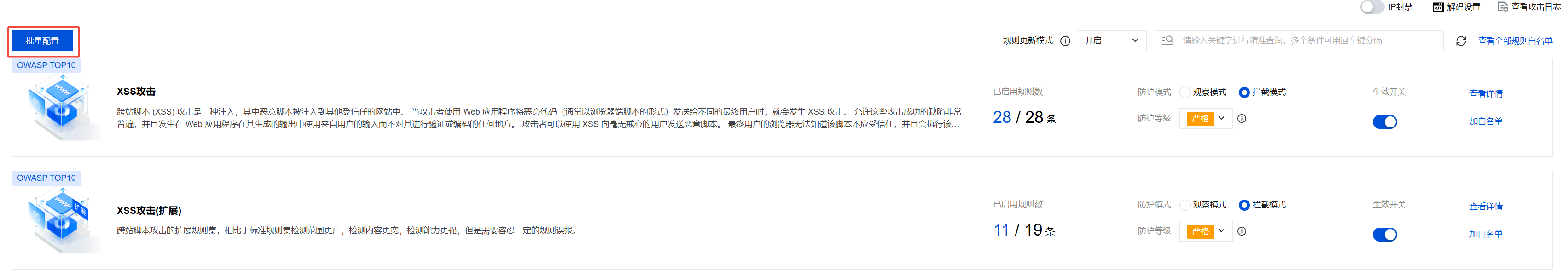 4. 单击左上角批量配置,可按需选择规则集批量配置防护模式与防护等级,单击应用即可成功配置。