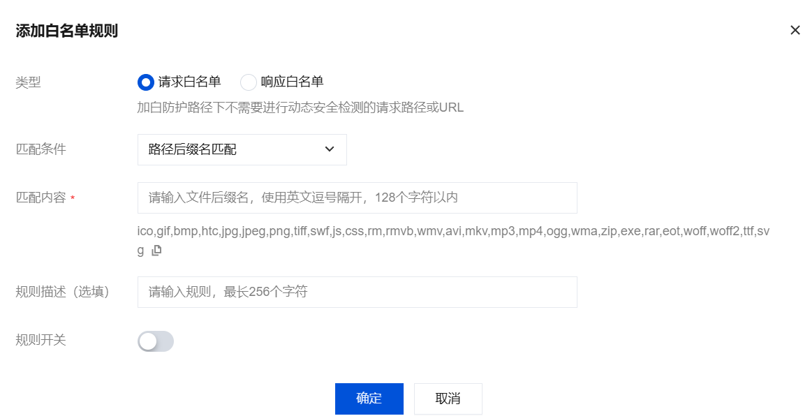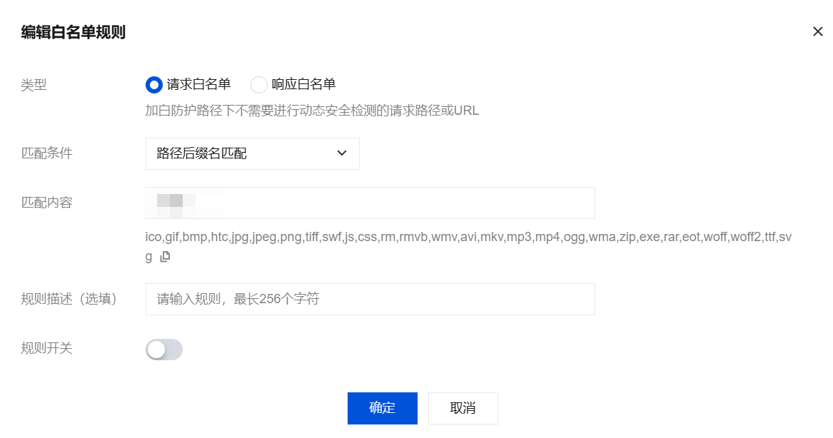 匹配内容:当匹配条件为路径后缀匹配,默认给出需要加白的文件后缀名称,包括:ico、gif、bmp、htc、jpg、jpeg、png、tiff、swf、js、css、rm、rmvb、wmv、avi、mkv、mp3、mp4、ogg、wma、zip、exe、rar、eot、woff、woff2、ttf、svg。您可以根据实际情况进行修改。 输入其他匹配条件,请按照实际情况输入白名单路径。
