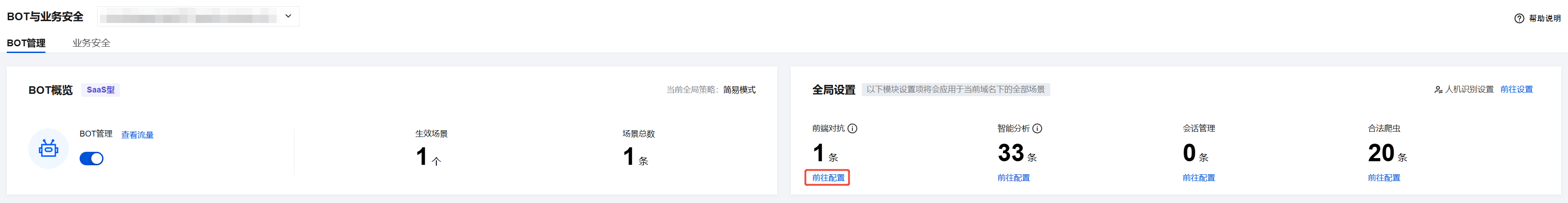 2. 在 BOT 与业务安全页面,左上角选择需要防护的域名,在全局设置中,单击前端对抗模块的前往配置。