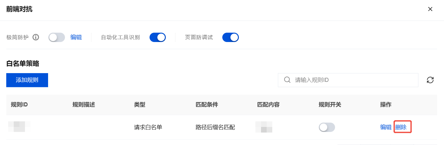 3. 在前端对抗页面,选择所需规则,单击删除,弹出“确认删除”弹窗。
