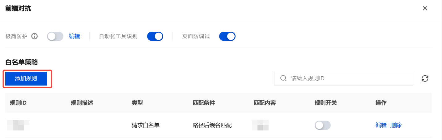 3. 在前端对抗页面,单击添加规则,弹出添加白名单规则窗口。