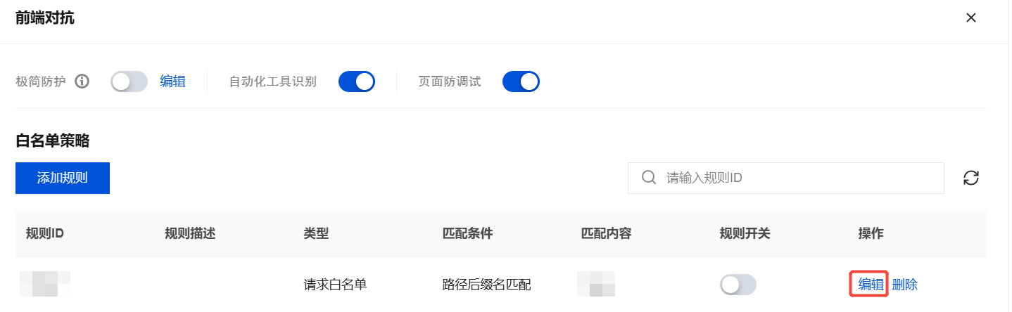 3. 在前端对抗页面,选择所需规则,单击编辑,弹出编辑白名单规则窗口。