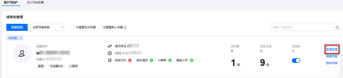 选择需要防护的业务场景后,系统将自动生成针对所选场景的自定义防护规则,并默认设为观察模式。 场景创建完成后您可以在 BOT 防护 > 场景化管理中找到刚创建的场景,单击查看配置,查看生成的自定义规则。并根据命中日志,将规则调整为拦截模式。