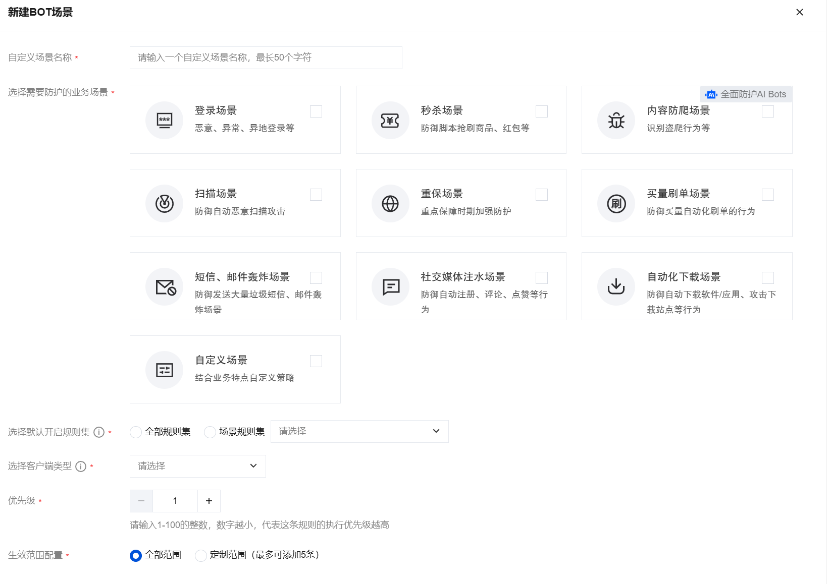 生效范围:该场景在该域名下的生效范围,支持全部范围和定制范围。