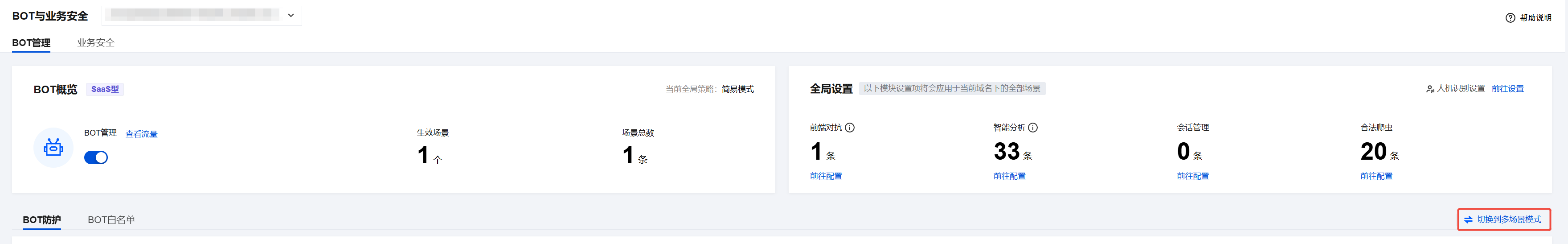 4. 切换到多场景模式后,在 BOT 防护页面的基础防护中,将开启部分默认配置并支持自定义调整。