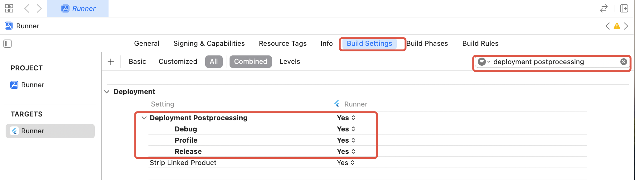 strip style,将其中 Release 的值设置为 Non-Global Symbols 。