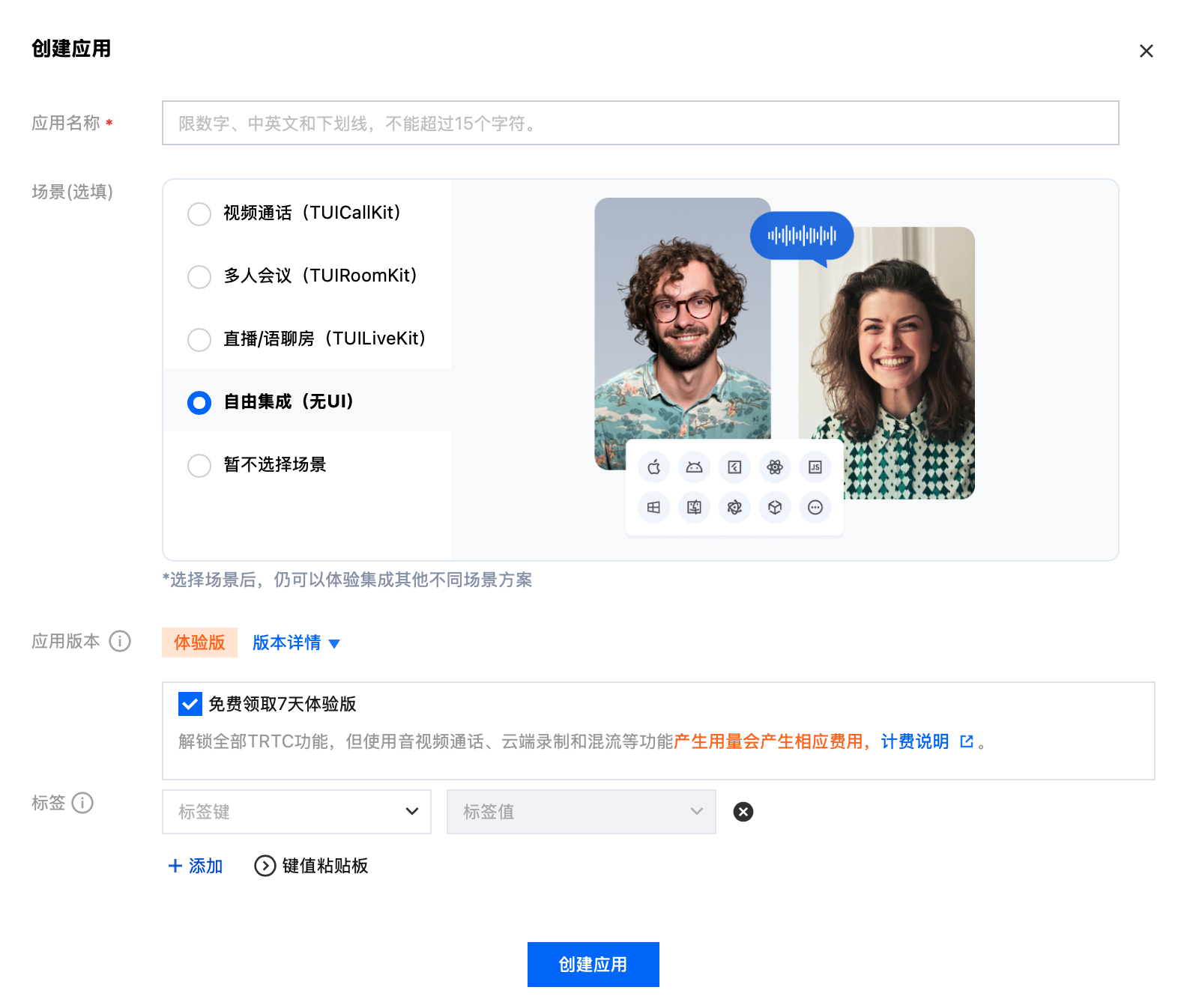 在弹窗中输入您的应用名称,选择自由集成(无UI)场景,勾选免费领取7天体验版,单击创建应用。