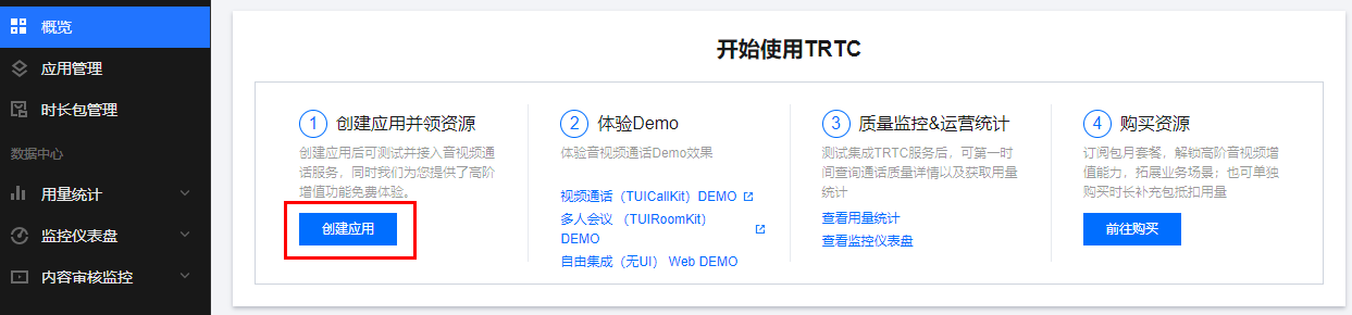 SDKAppID 是用于区分客户账号的唯一标识。我们建议每一个独立的 App 都申请一个新的 SDKAppID。不同 SDKAppID 之间的消息是天然隔离的,不能互通。您必须拥有正确的 SDKAppID,才能进行初始化。您可以在 实时音视频控制台 查看所有的 SDKAppID,单击创建应用按钮,创建新的 SDKAppID。