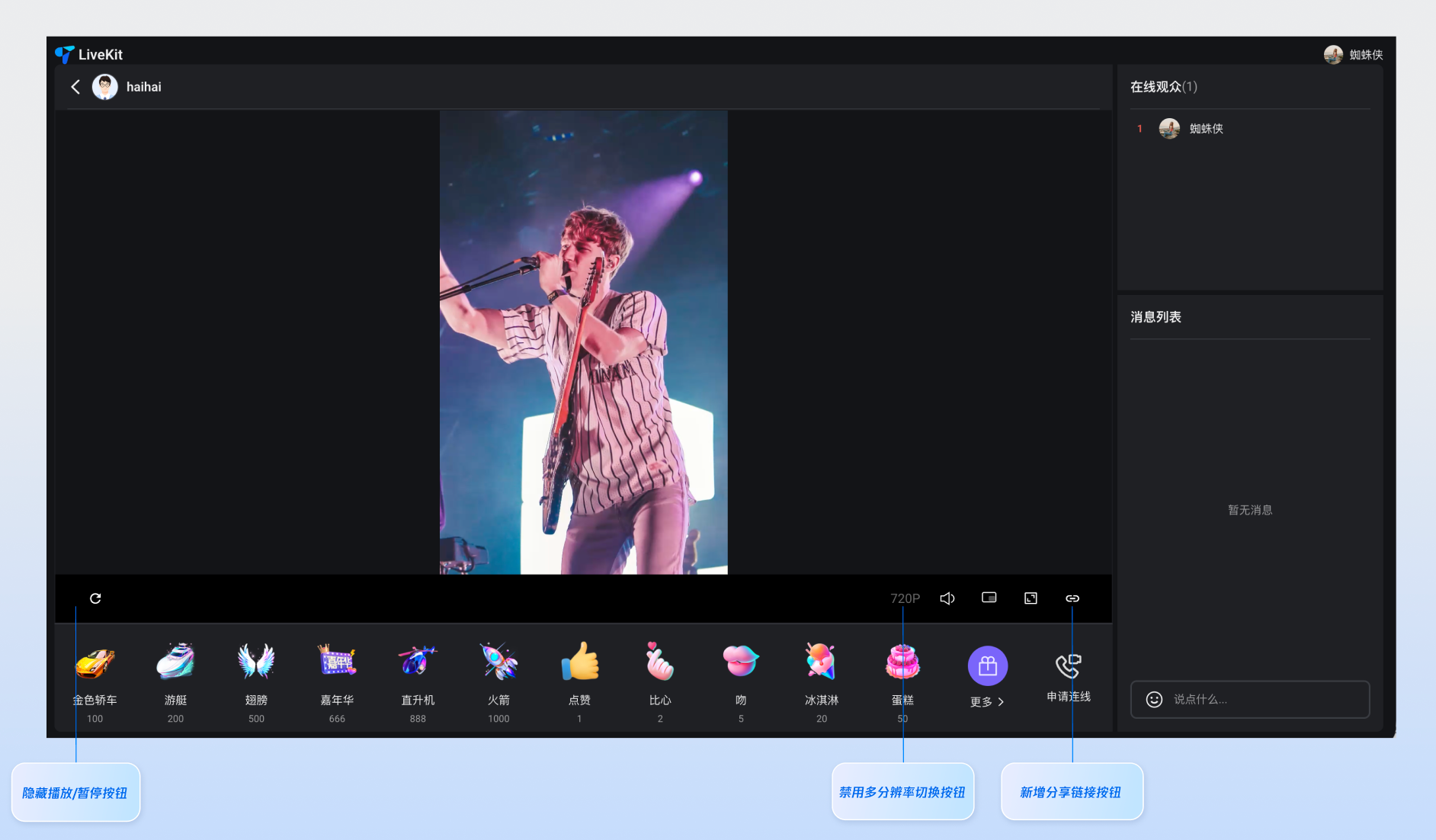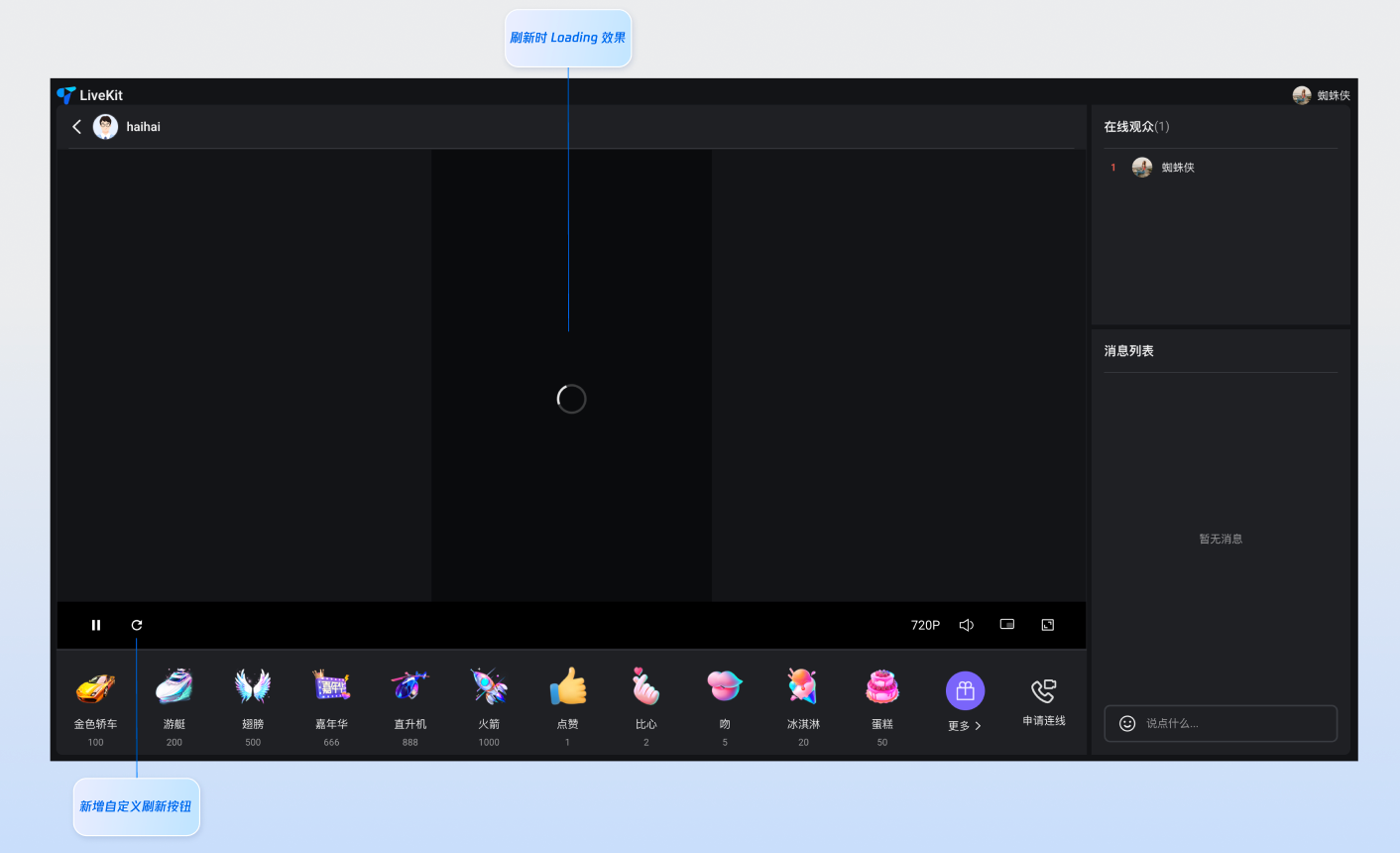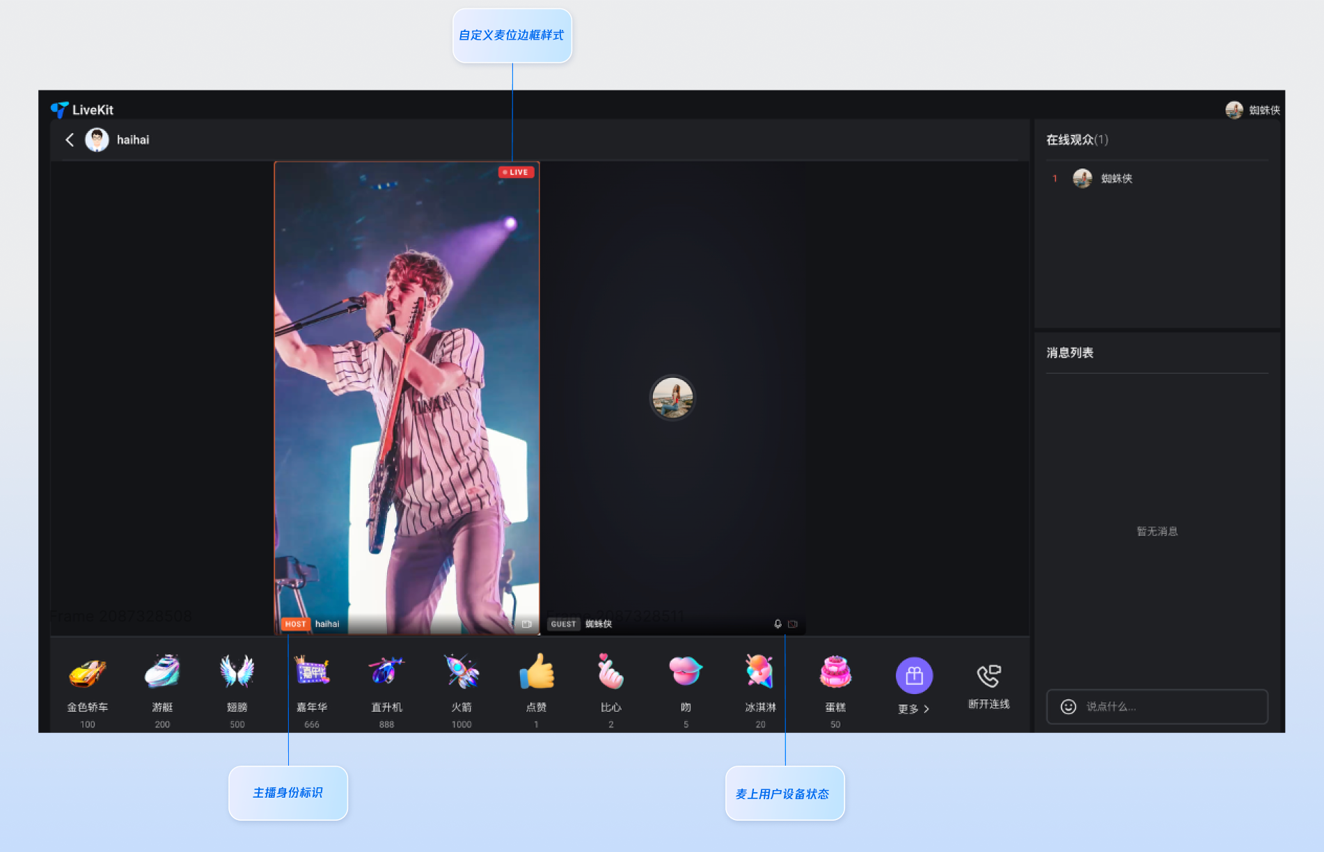 可定制化 UI | 为了满足多样化的业务场景,LiveView 提供组件 UI 自定义插槽,让您能够完全掌控连麦用户的视频流区域,重写其 UI 展示,灵活定义连麦用户的头像、昵称、状态等信息,轻松打造符合您品牌风格的独特视觉体验。 |