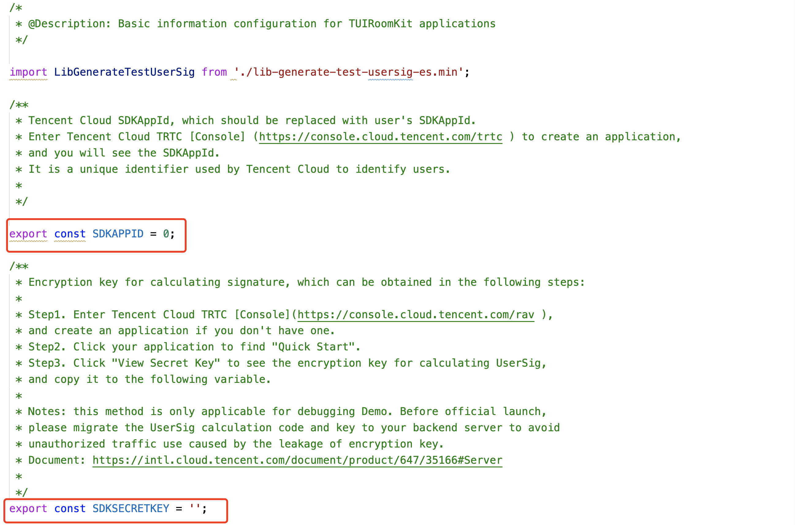 2. 打开 TUIRoomKit/Web/example/vite-vue3-ts/src/config/basic-info-config.js 文件,并输入激活服务时获得的 SDKAppIDSDKSecretKey