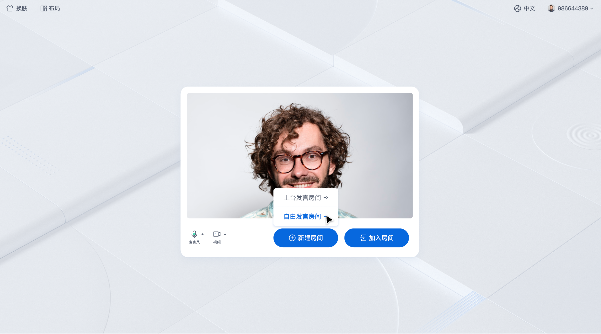 单击新建房间创建您的第一个会议房间,房间类型分别为举手发言房间自由发言房间