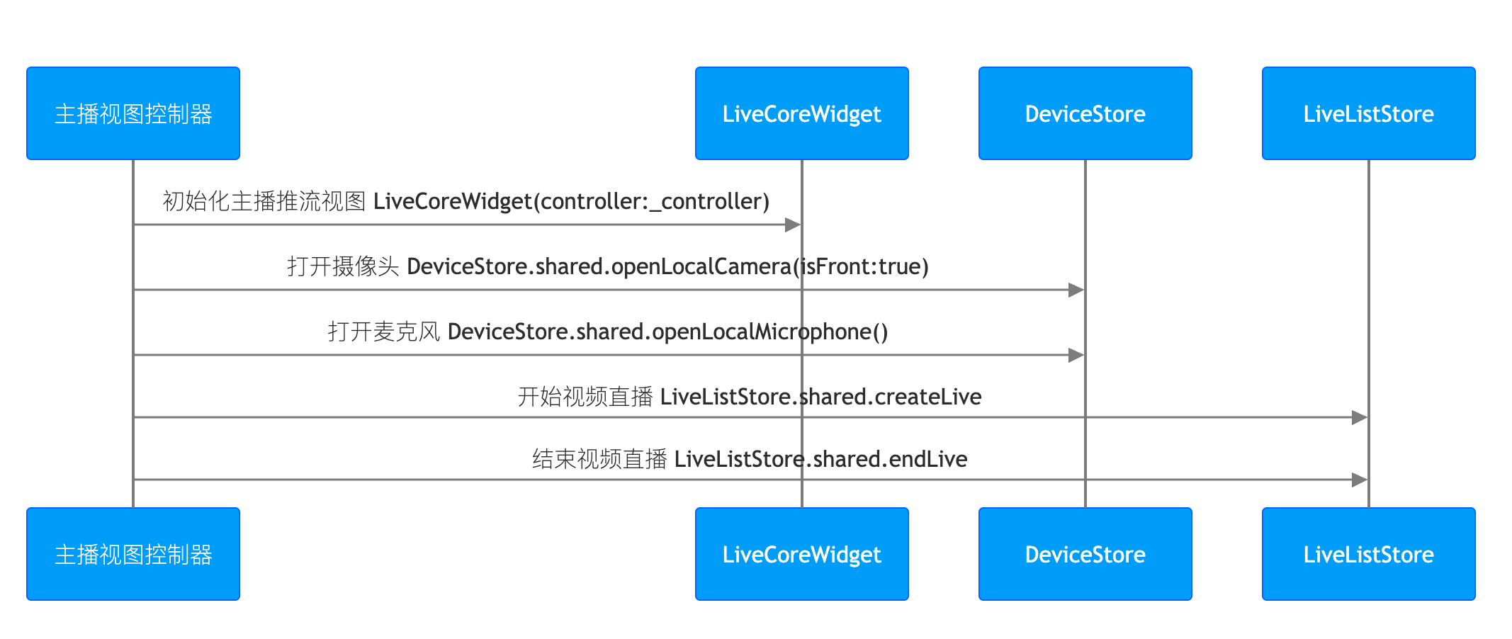 openLocalCamera、openLocalMicrophone 接口打开摄像头和麦克风,您无需做额外操作,LiveCoreWidget 会自动预览当前摄像头的视频流,示例代码如下:import 'package:flutter/material.dart';import 'package:atomic_x_core/atomicxcore.dart';/// YourAnchorPage 代表您的主播开播页面class YourAnchorPage extends StatefulWidget {final String liveId;const YourAnchorPage({super.key, required this.liveId});@overrideState<YourAnchorPage> createState() => _YourAnchorPageState();}class _YourAnchorPageState extends State<YourAnchorPage> {late final LiveCoreController _controller;@overridevoid initState() {super.initState();_controller = LiveCoreController.create();_controller.setLiveID(widget.liveId);// 打开设备_openDevices();}void _openDevices() {// 1. 打开前置摄像头DeviceStore.shared.openLocalCamera(true);// 2. 打开麦克风DeviceStore.shared.openLocalMicrophone();}@overrideWidget build(BuildContext context) {return Scaffold(body: Stack(children: [LiveCoreWidget(controller: _controller),],),);}}