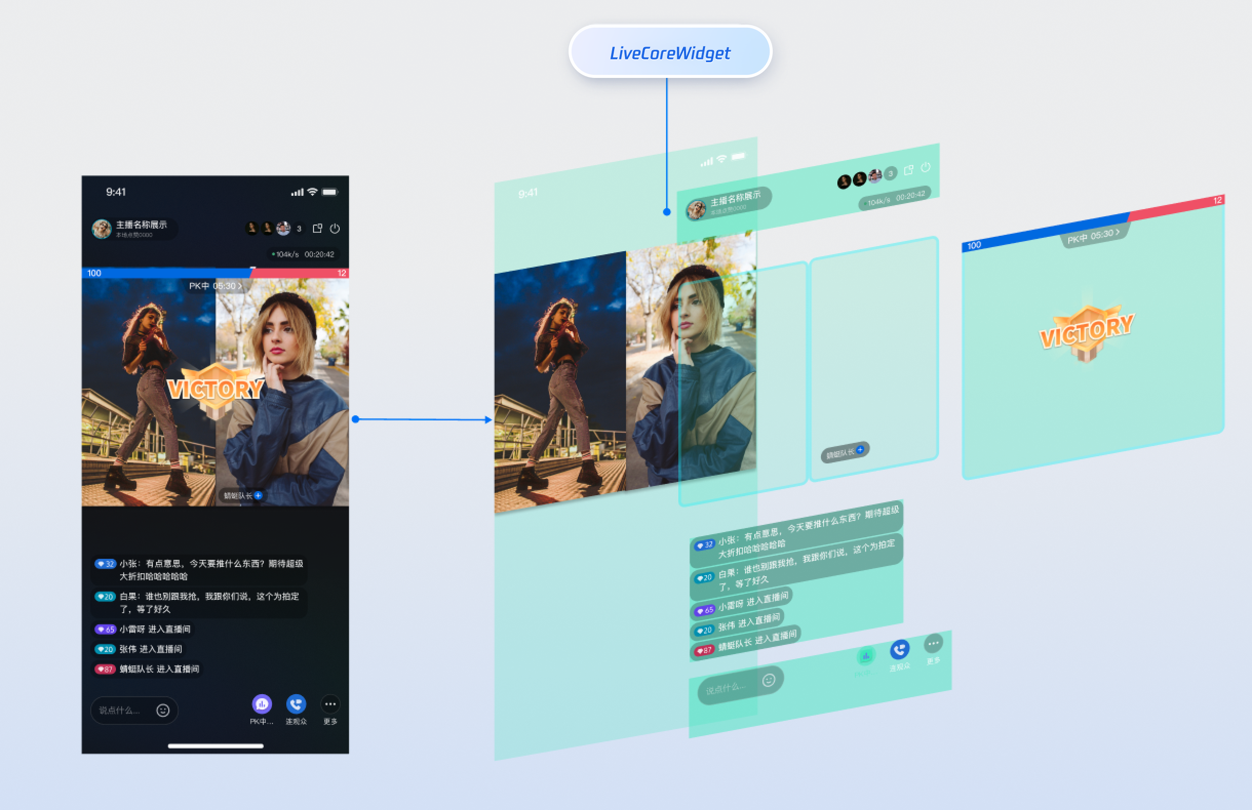 LiveCoreWidget | 直播视频流展示与交互的核心视图组件:负责视频流渲染和视图挂件处理,支持主播直播、观众连麦、主播连线等场景。 | |