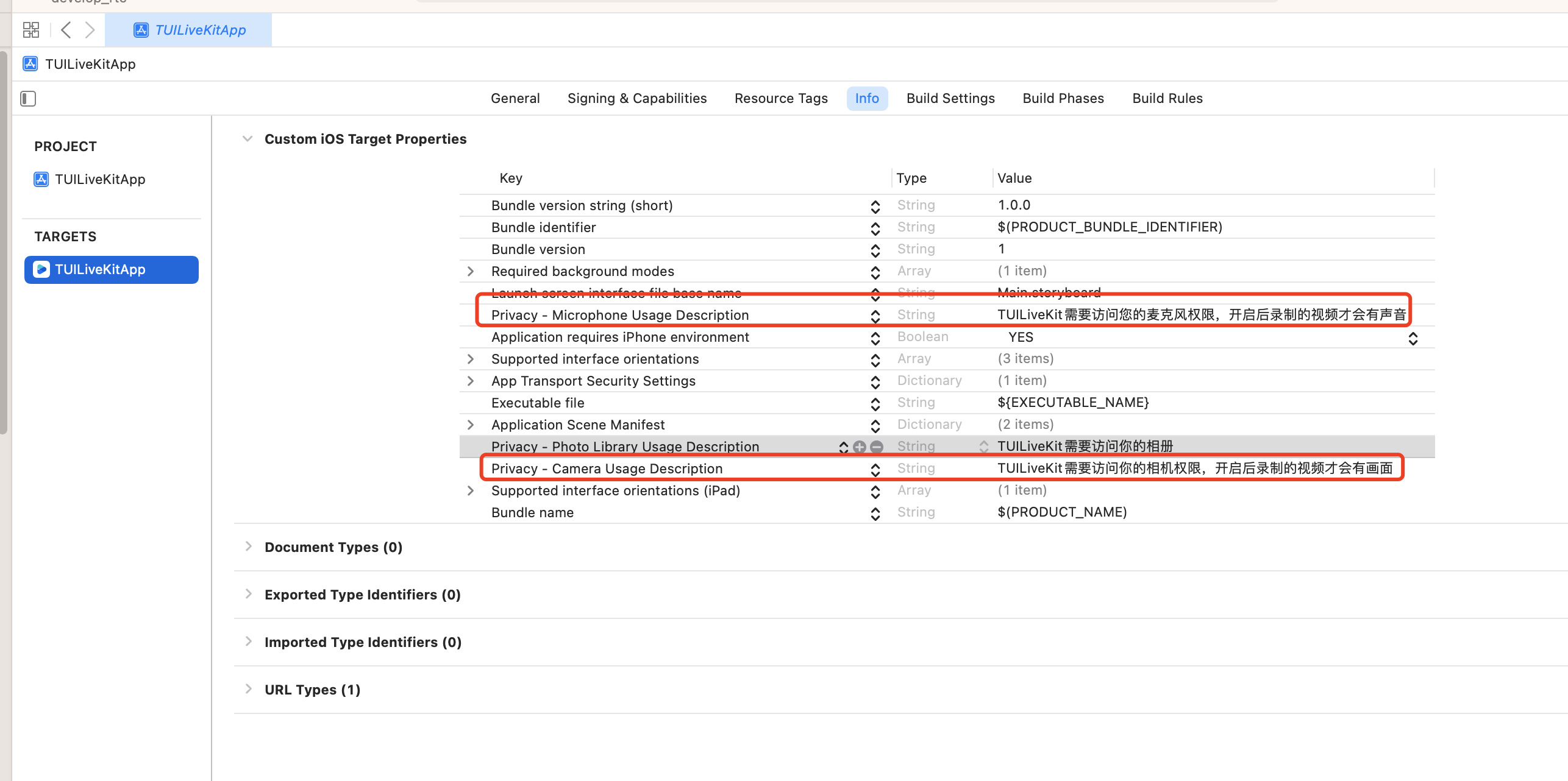 <key>NSCameraUsageDescription</key><string>TUILiveKit需要访问你的相机权限,开启后录制的视频才会有画面</string><key>NSMicrophoneUsageDescription</key><string>TUILiveKit需要访问您的麦克风权限,开启后录制的视频才会有声音</string>