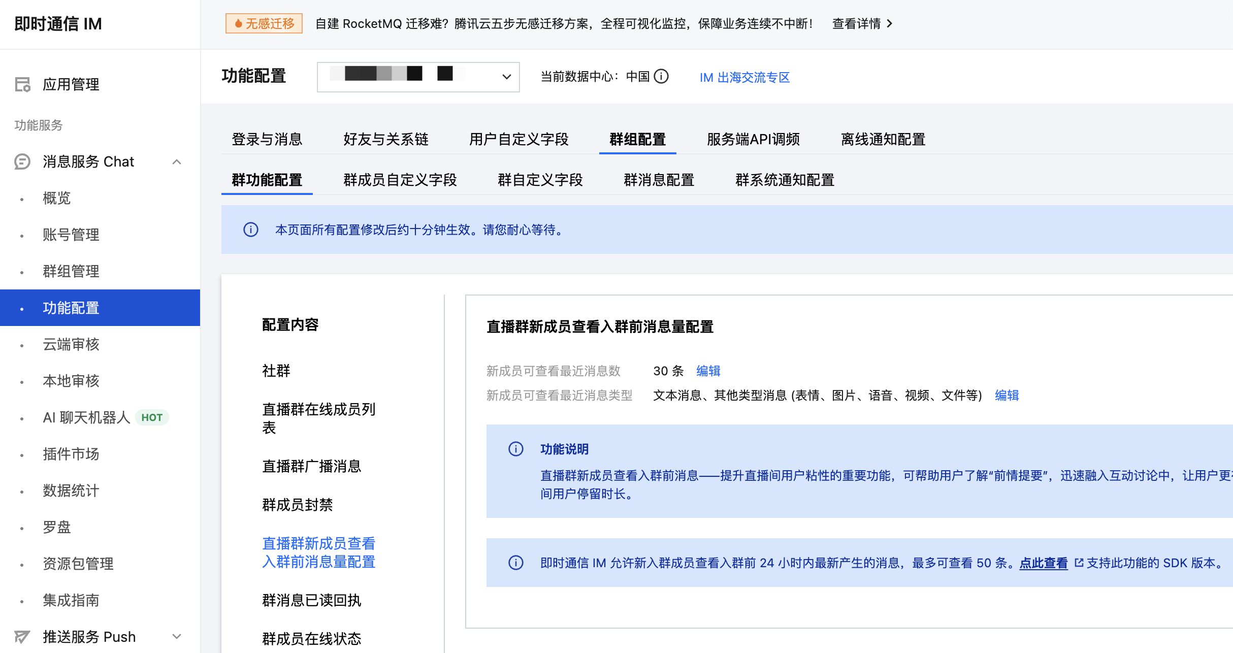 2. 在左侧导航栏按照路径:消息服务 Chat > 功能配置 > 群组配置 > 群功能配置 > 直播群新成员查看入群前消息量配置进行导航。