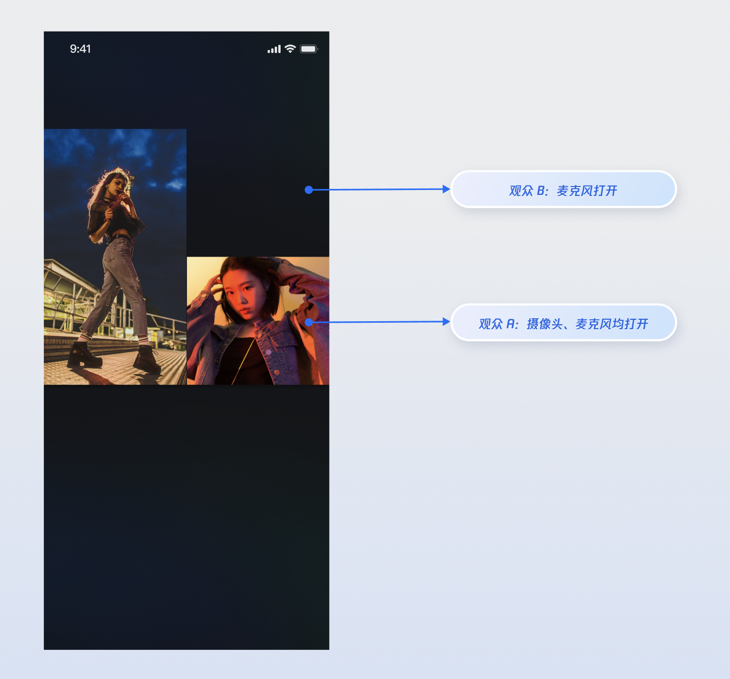 当您集成以上功能实现后,请分别使用两个观众与主播进行连麦操作,观众 A 同时打开摄像头和麦克风,观众 B 只打开麦克风,运行效果如下,您可以参考下一章节 完善 UI 细节 来定制您想要的 UI 逻辑。