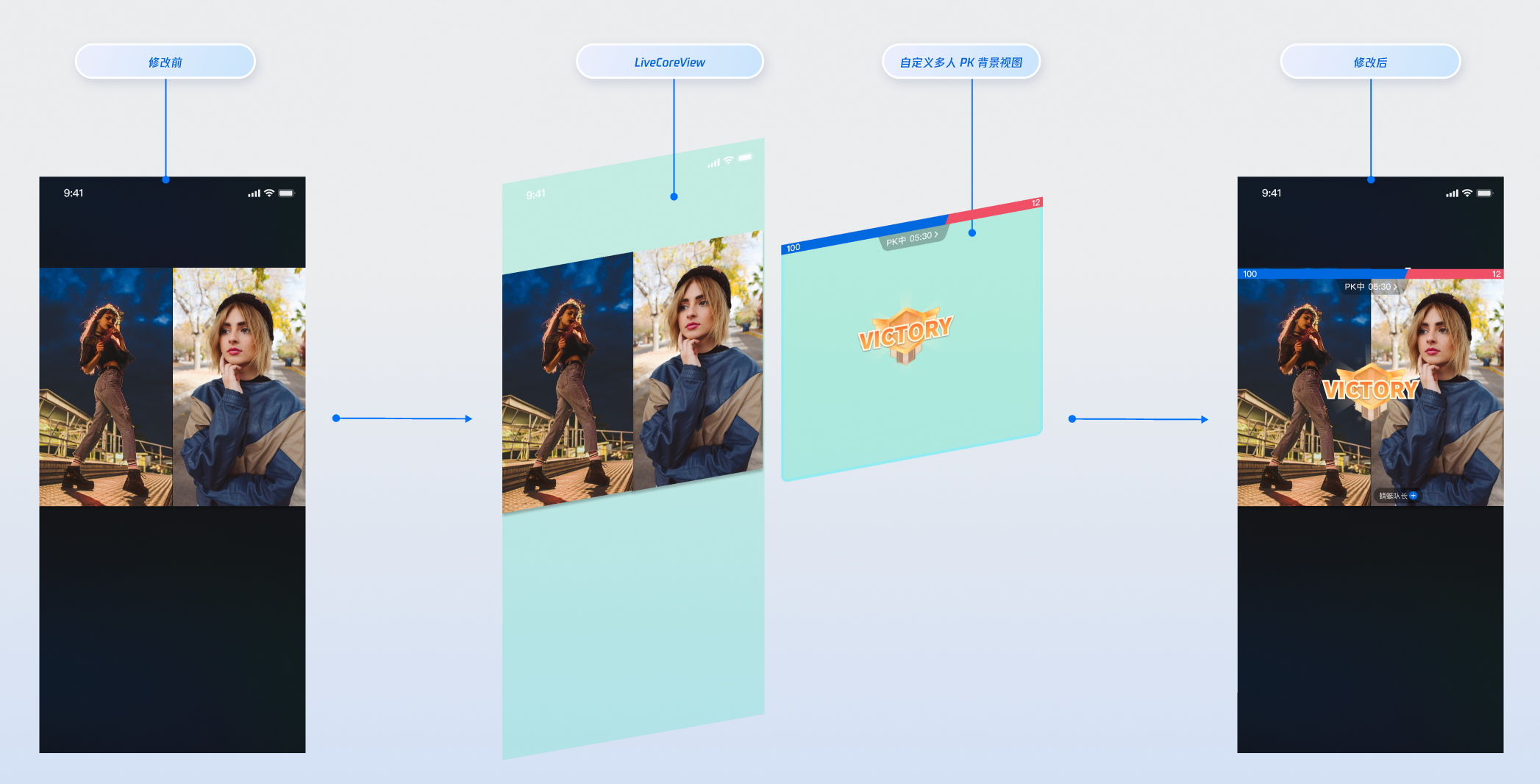 在实际场景中,您可能需要同时自定义连线主播视图、PK 用户视图和 PK 容器视图。以下示例展示了如何组合使用: