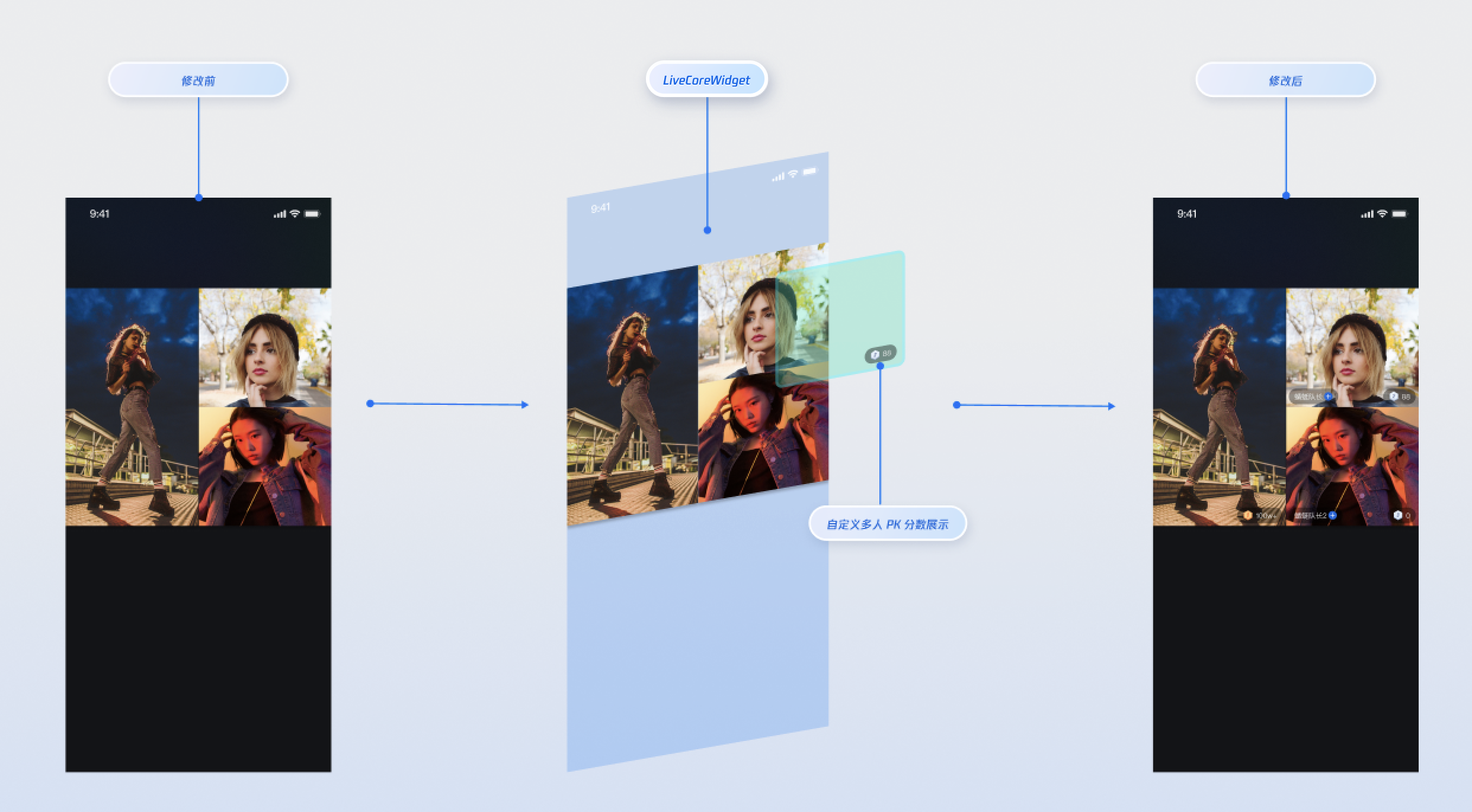 LiveCoreWidget | 直播视频流展示与交互的核心视图组件:负责视频流渲染和视图挂件处理,支持主播直播、观众连麦、主播连线等场景。 | |