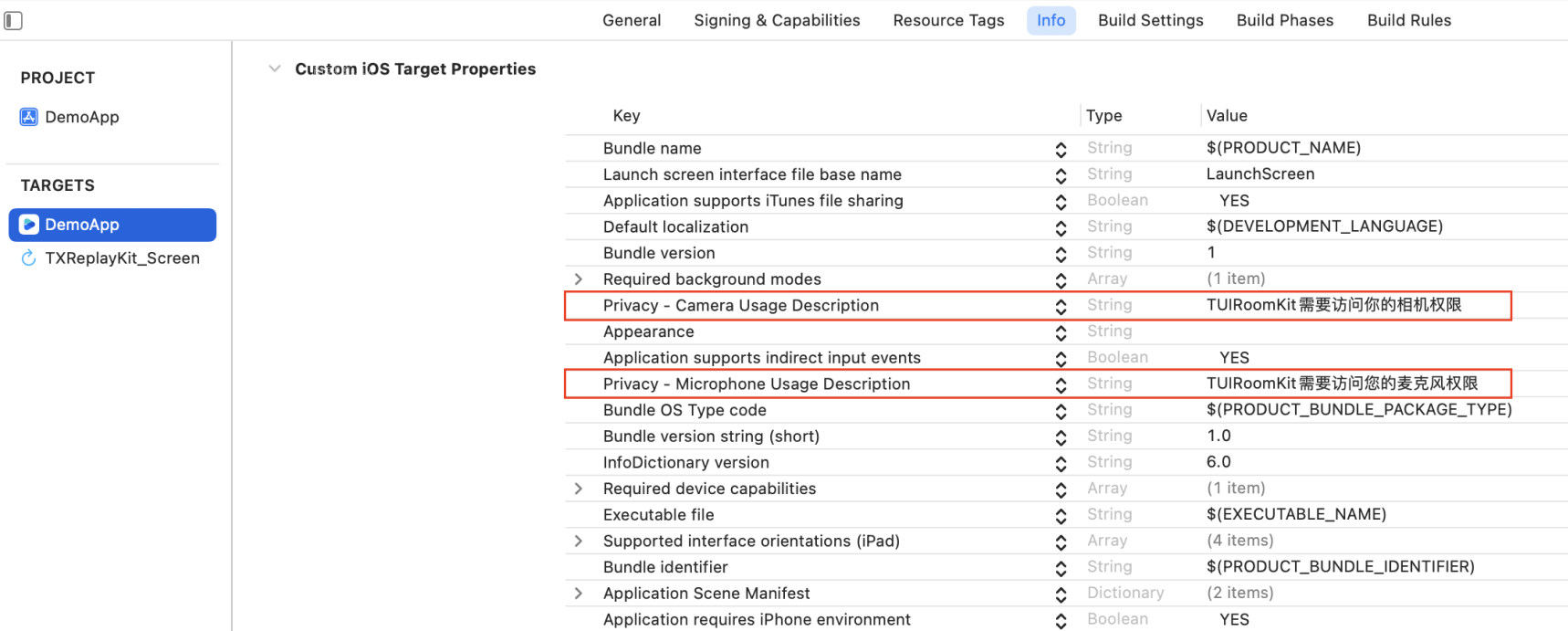 Info.plist 文件中添加相机和麦克风的使用权限说明。<key>NSCameraUsageDescription</key><string>TUIRoomKit需要访问您的相机权限</string><key>NSMicrophoneUsageDescription</key><string>TUIRoomKit需要访问您的麦克风权限</string>