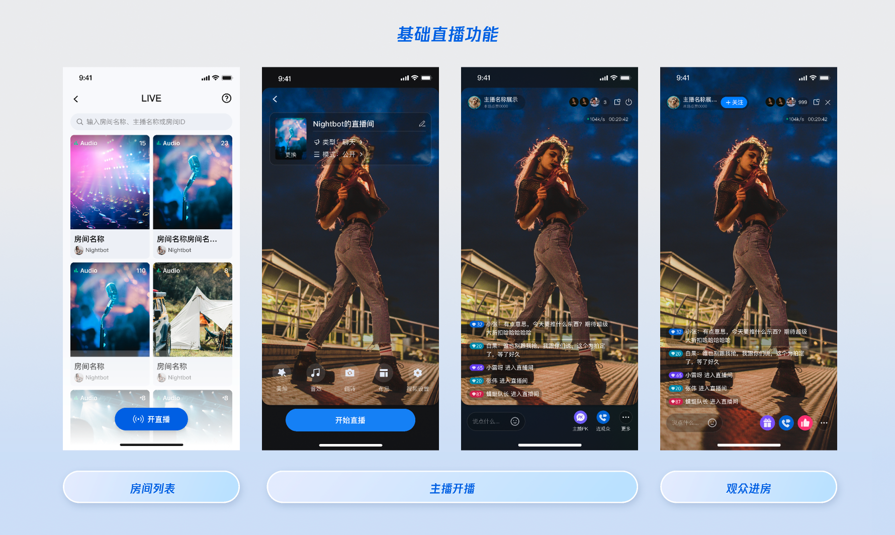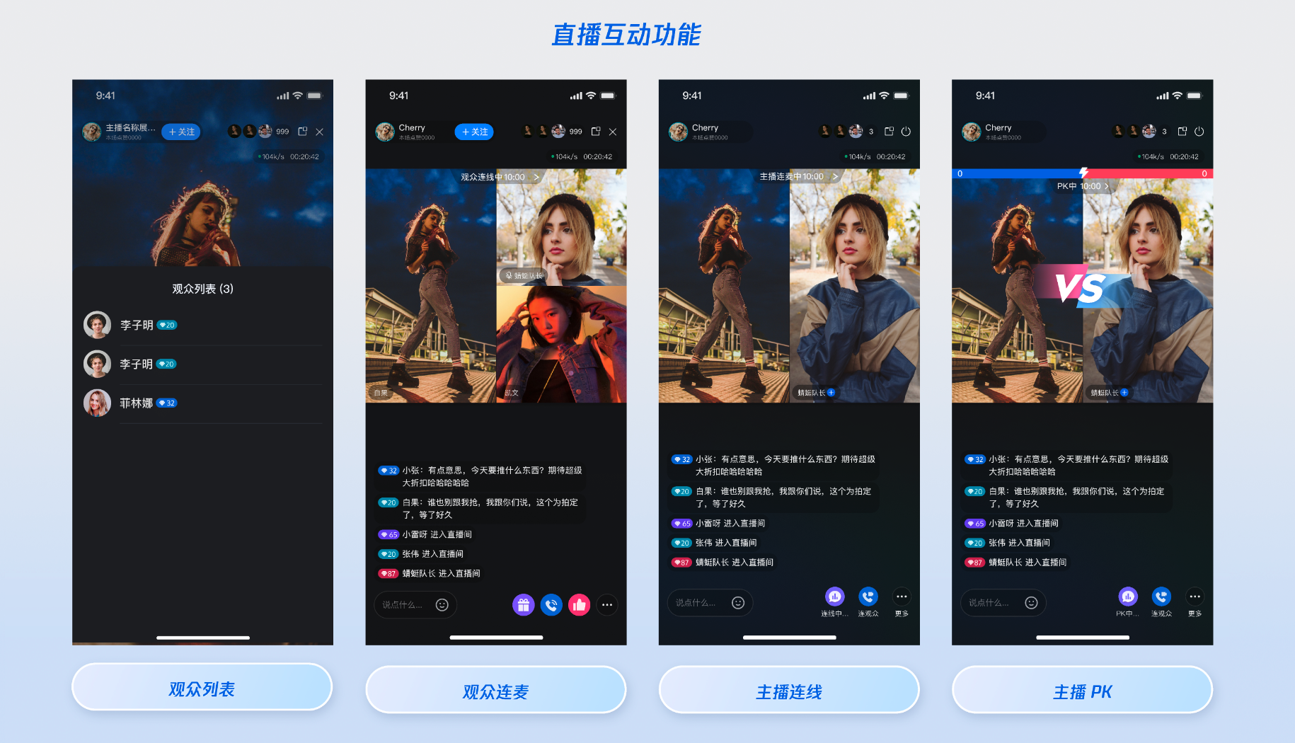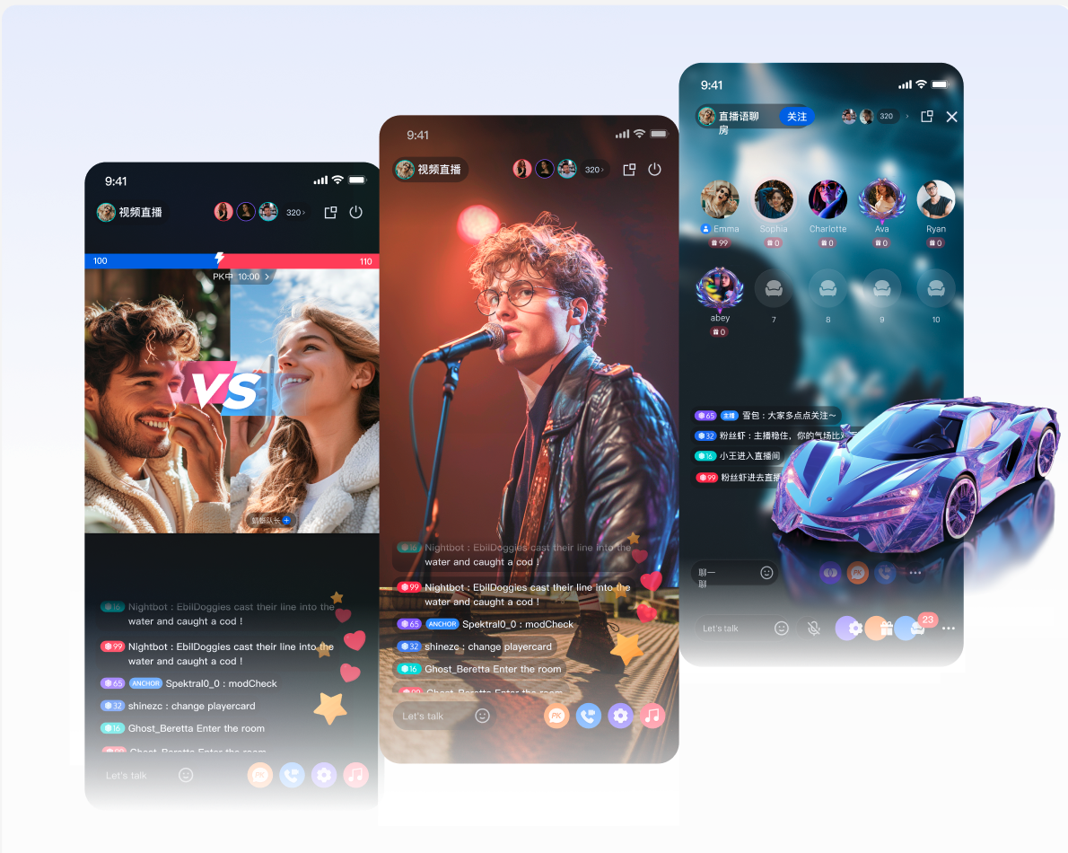 实时互动:多人连麦、观众列表、主播连线、跨房 PK。