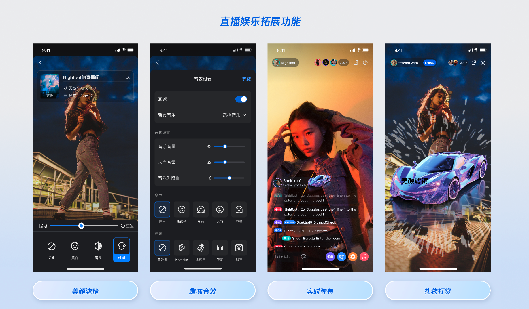 娱乐特效:美颜滤镜、礼物打赏、实时弹幕、趣味音效。