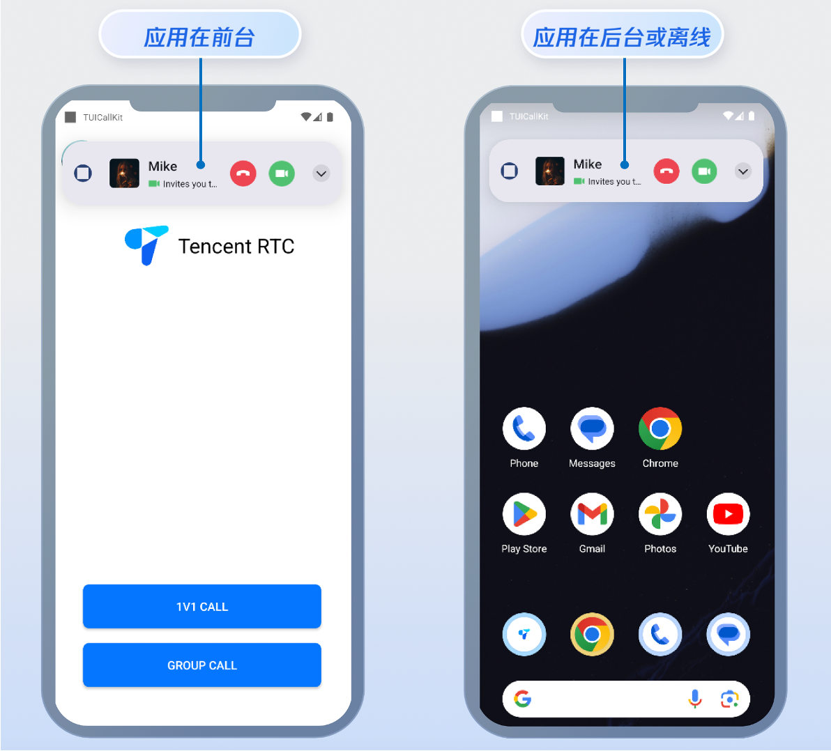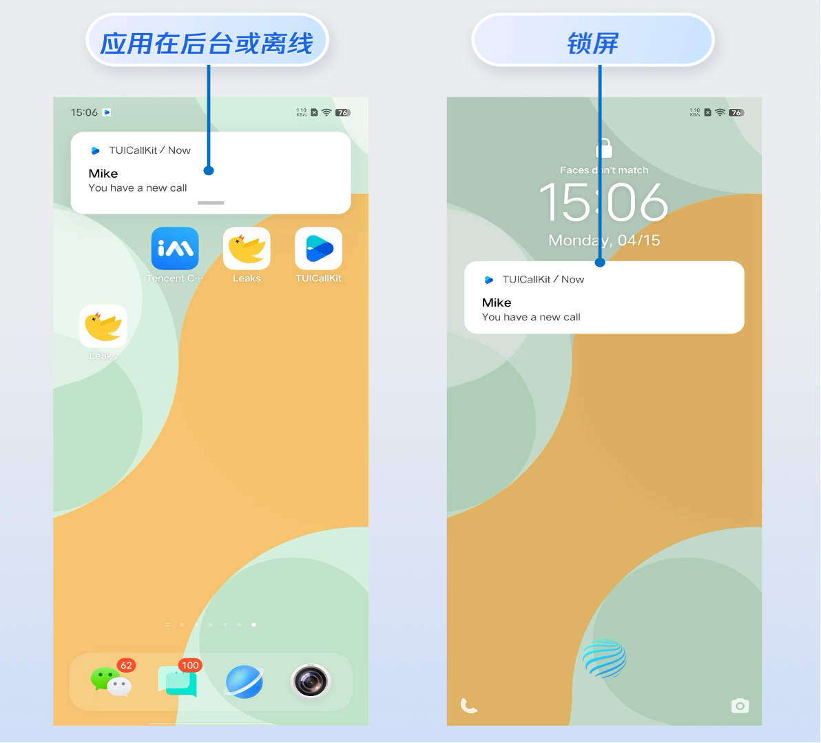 单人通话时,如果在超时时间内上线,会触发来电邀请;群组通话,如果在超时时间内上线,会拉起未处理的20条群消息,如果存在通话邀请,则触发来电邀请事件。
