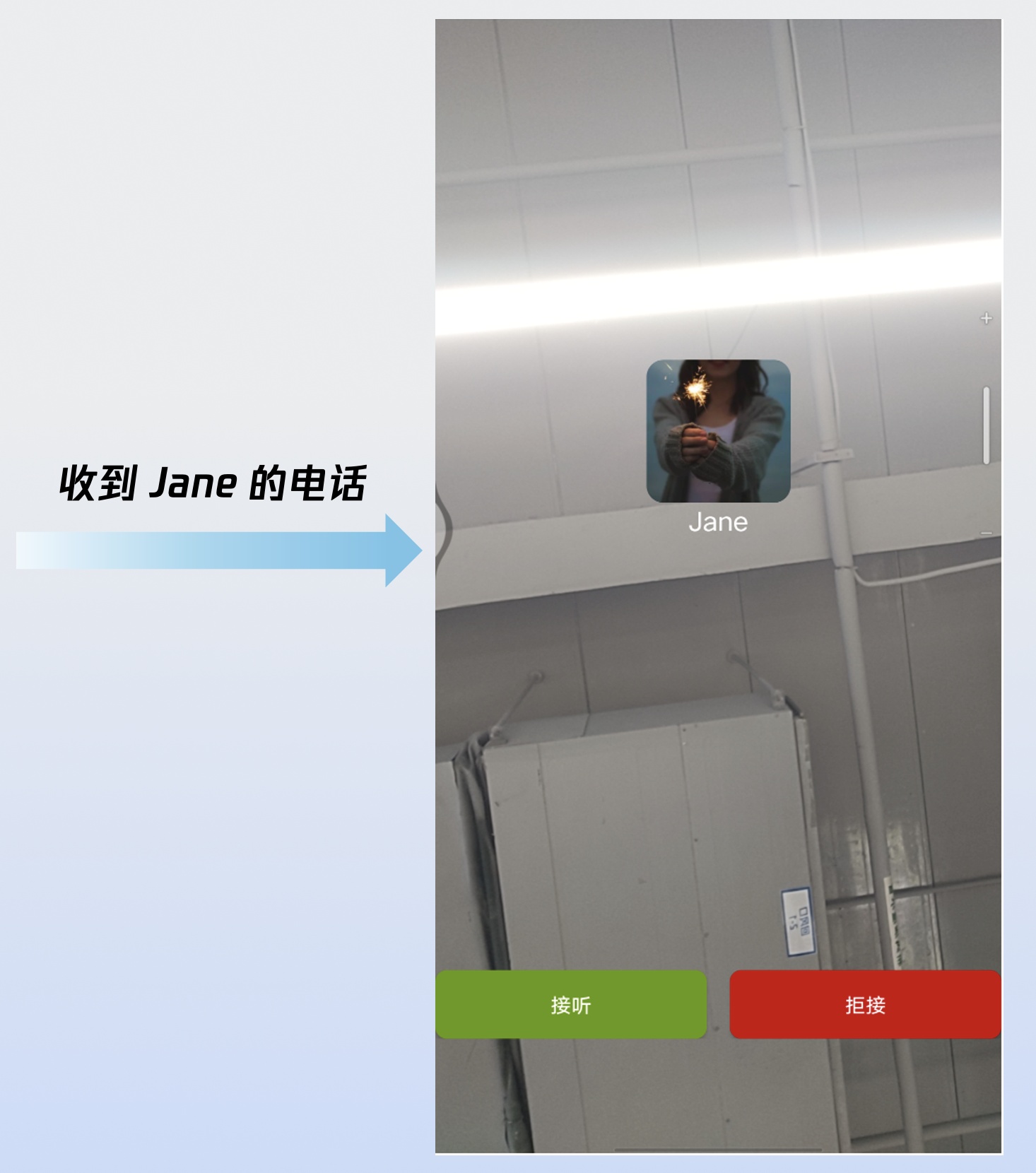 您需要创建一个通话页面,当收到来电时唤起通话页面,实现方式如下: