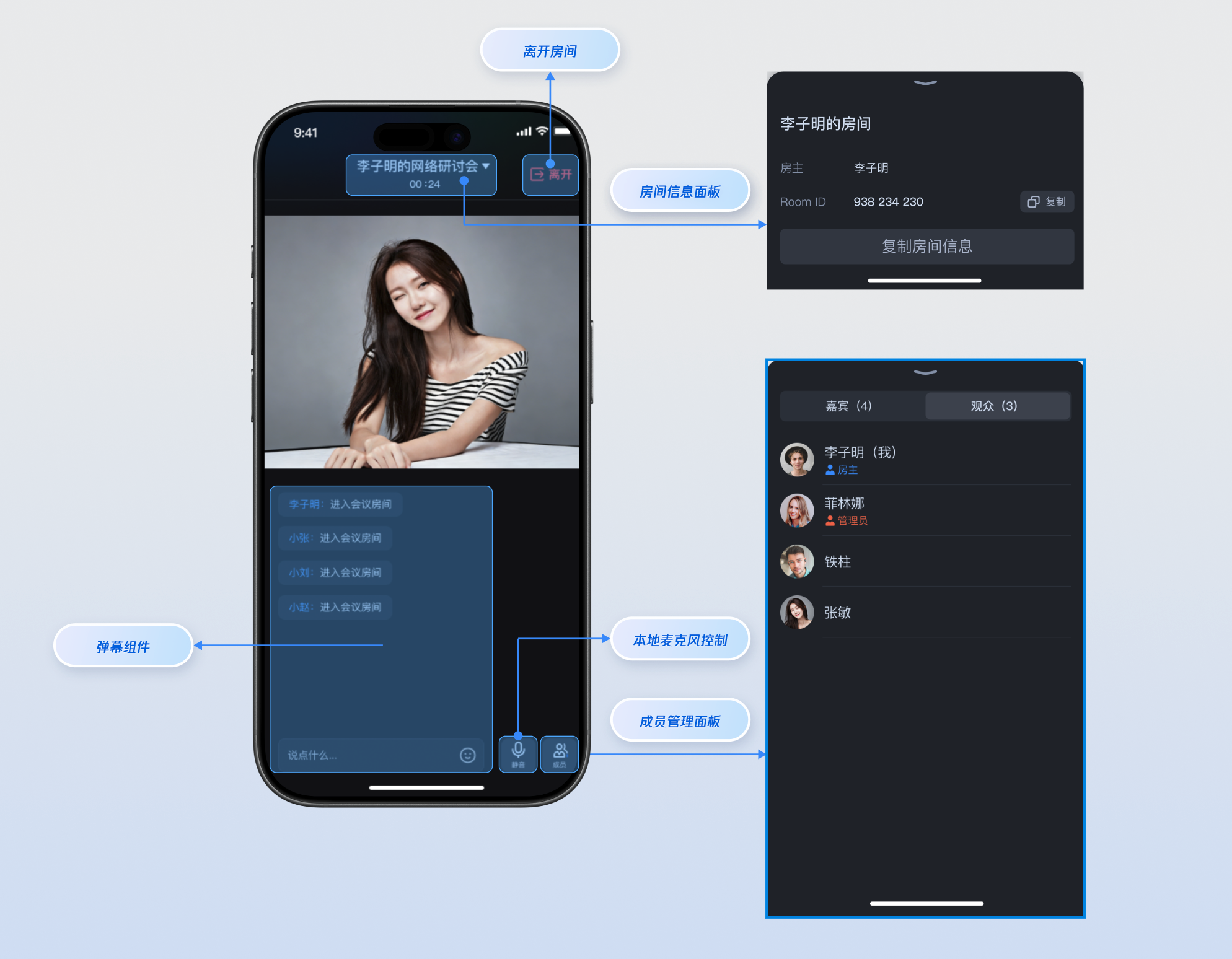 顶部导航栏,包含房间信息、摄像头和声音控制、退出房间功能入口。 | 可替换图标、调整背景透明度、添加自定义按钮(如录制、 窗口化)。 | |