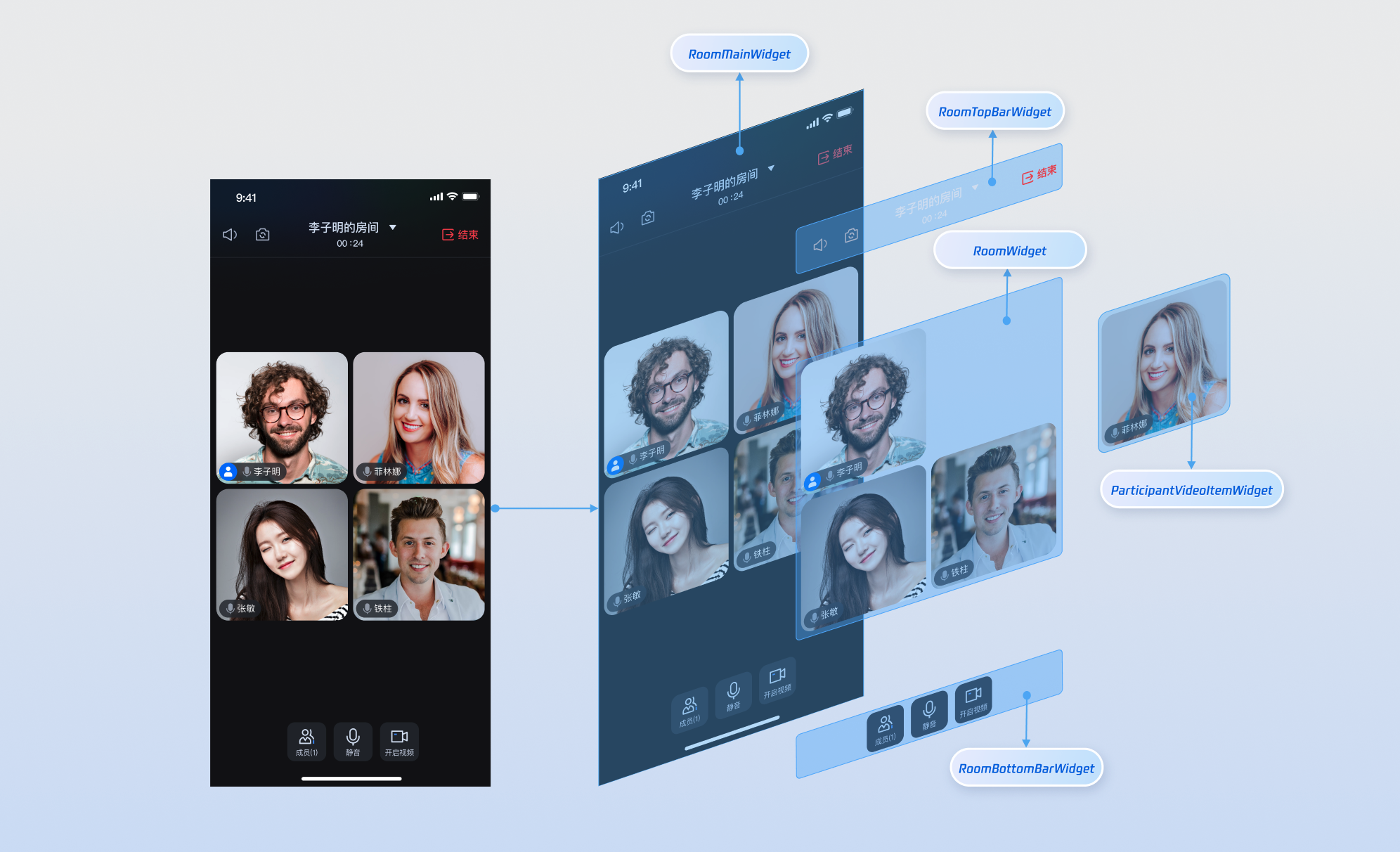 RoomMainWidget嵌入到应用中。实现方式: