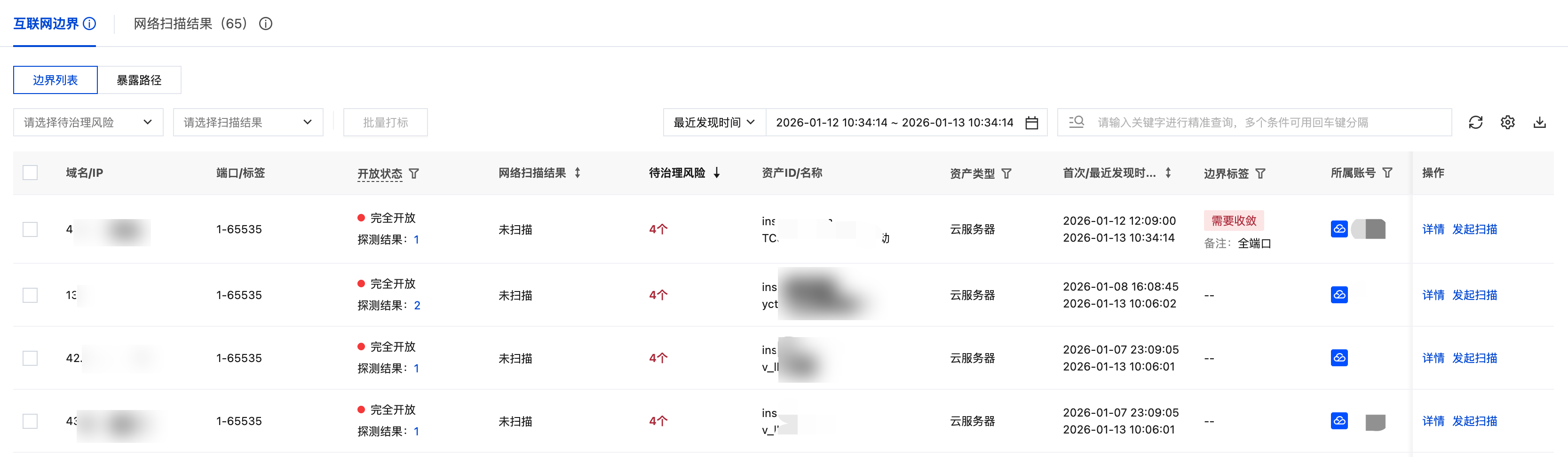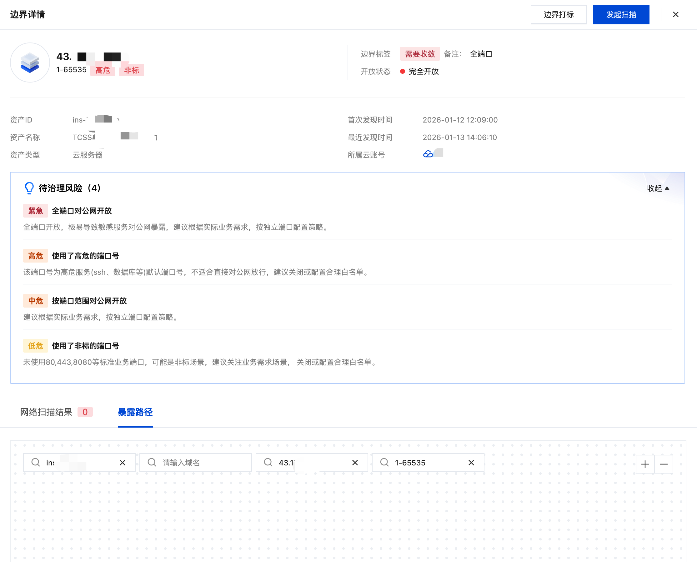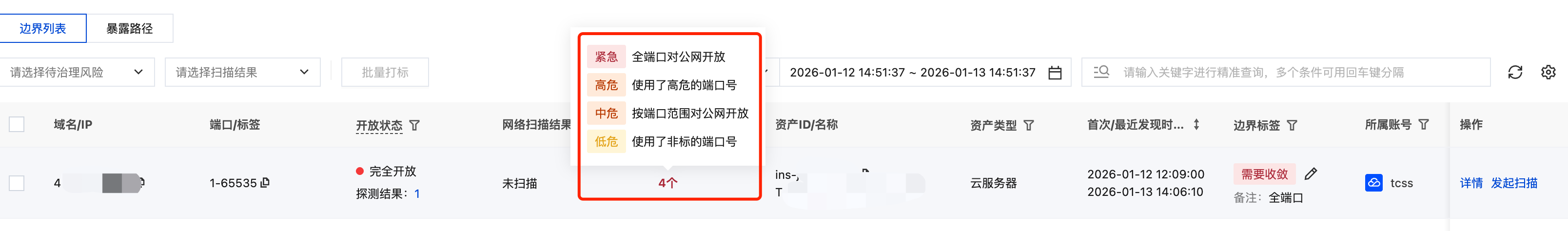 4. 在边界详情页面,支持通过切换 Tab 页面查看该互联网边界的扫描结果。
