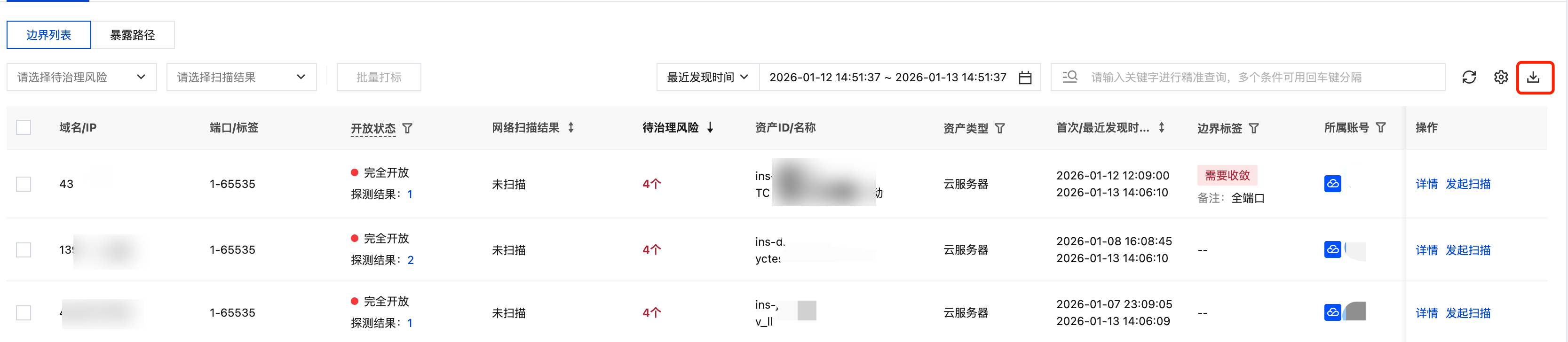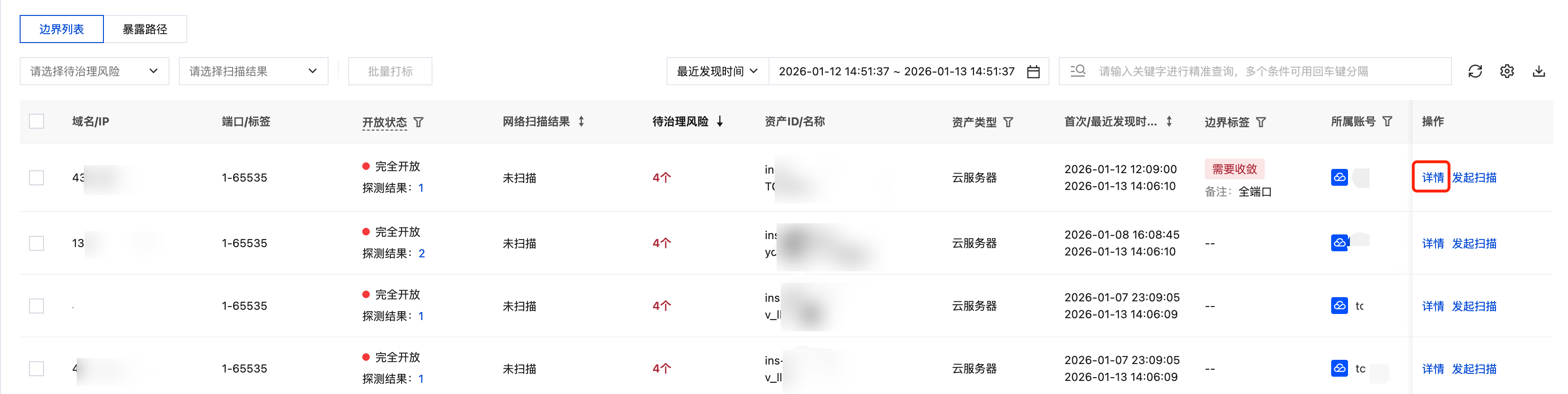 2. 在云边界分析 > 互联网边界 > 边界列表中,支持查看云上互联网边界的详细列表。