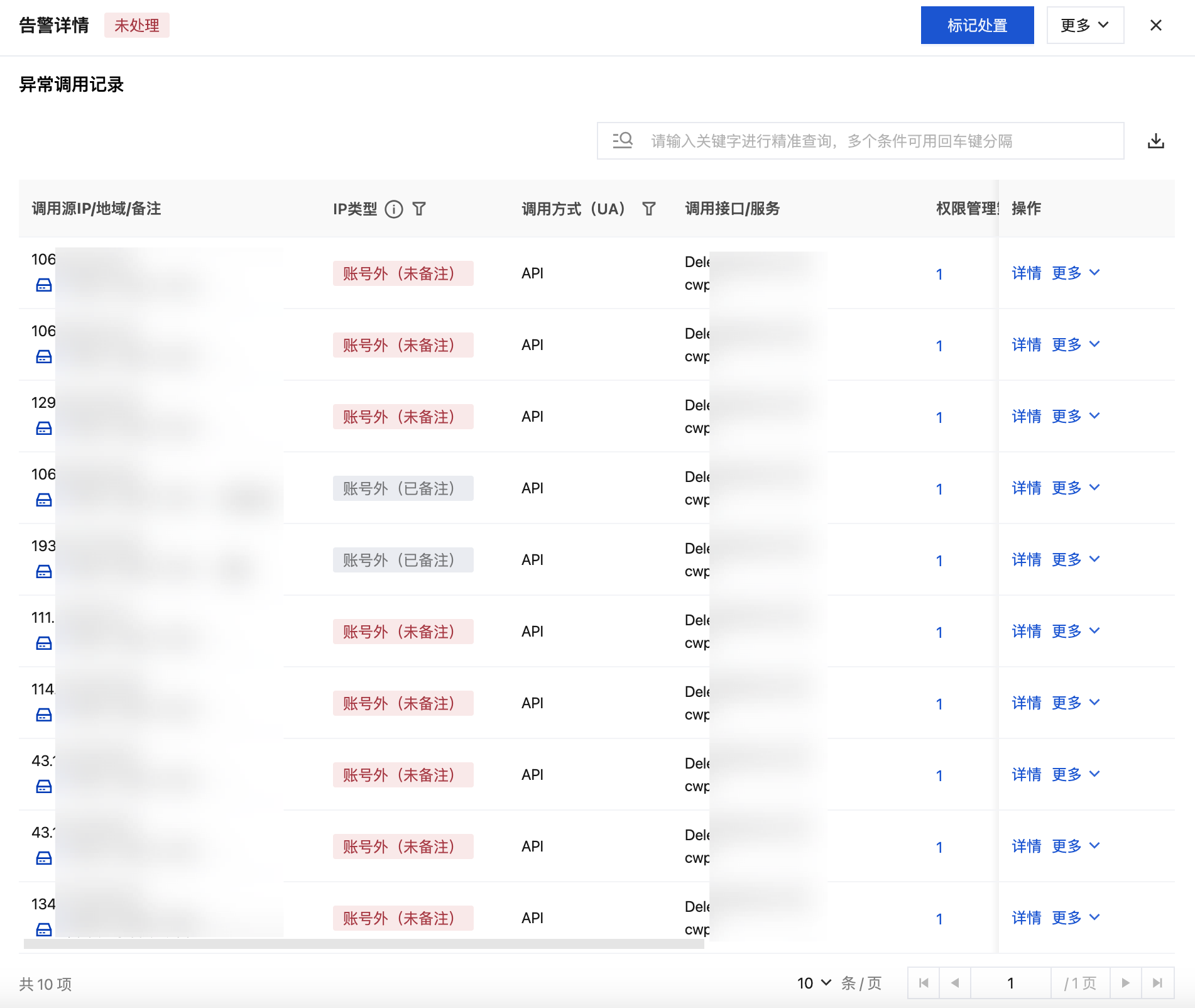 3. 在告警详情页面,选择所需调用源 IP,单击详情/更多。