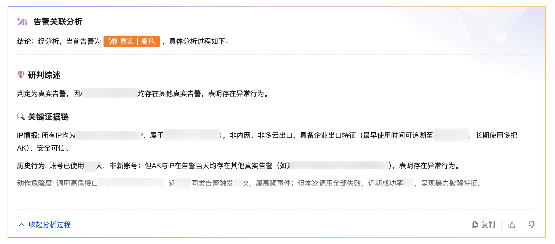 AI 研判机制深度融合异常调用记录与安全运营专家思维链,通过多维交叉验证请求源(IP/AK)的可信度、历史行为基线及权限边界,结合 API 调用时序与语义进行风险分析,精准判定真实告警或可疑告警,并输出处置与修复建议,实现闭环安全研判。