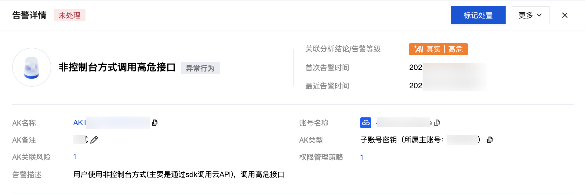 关联分析结论 | 真实|高危 | 结合调用记录以及腾讯云安全专家思维链,评定告警等级并输出分析结论。 支持筛选真实告警/可疑告警/分析中/未分析/分析失败。 真实告警:经验证确认存在明确风险,需重点关注并及时处置的告警。 可疑告警:经分析可能为误报,在当前业务场景下暂不视为有效告警,建议进行人工核实。 未分析:自定义告警策略不支持分析/临时密钥告警不支持分析。 分析失败:AI 分析任务创建失败/AI 分析任务调用失败/AI 分析结果解析失败/AI 分析超时。 |