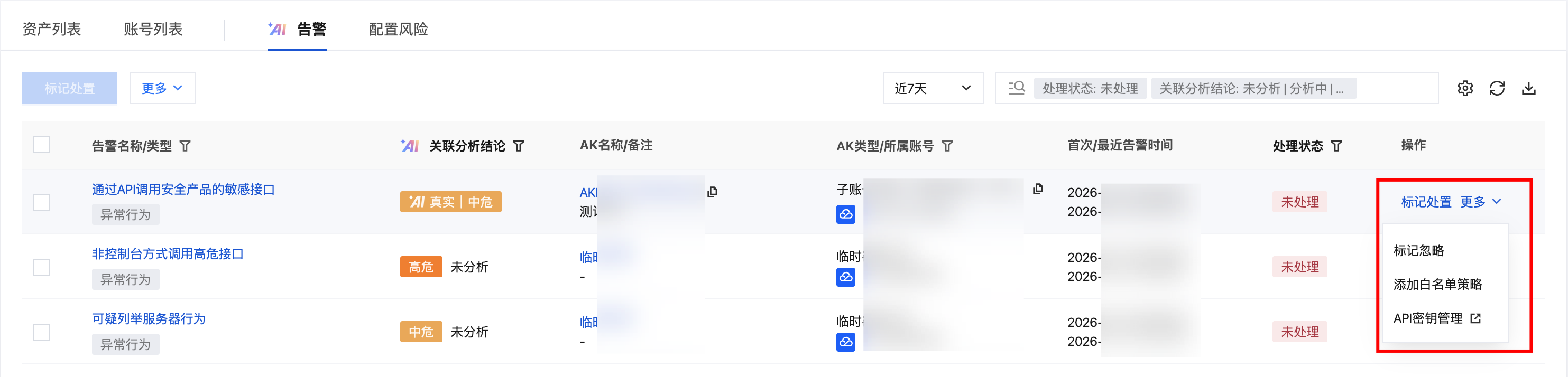 2. 告警列表支持从规则视角快速聚焦核心信息:告警内容(泄露、异常调用)、关联分析结论(真实/可疑告警),以及关联的 AK 与异常调用记录。同时,系统提供具体告警处置建议以指导响应。