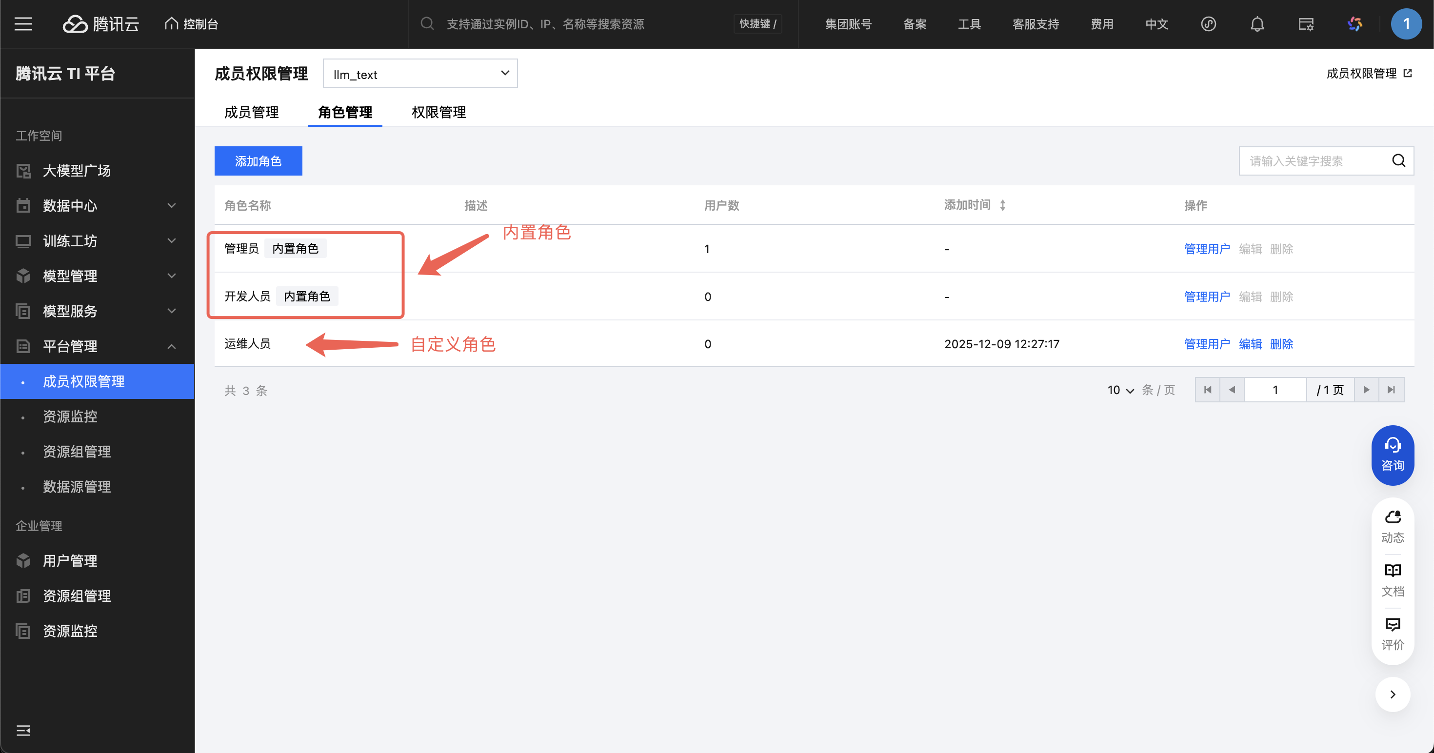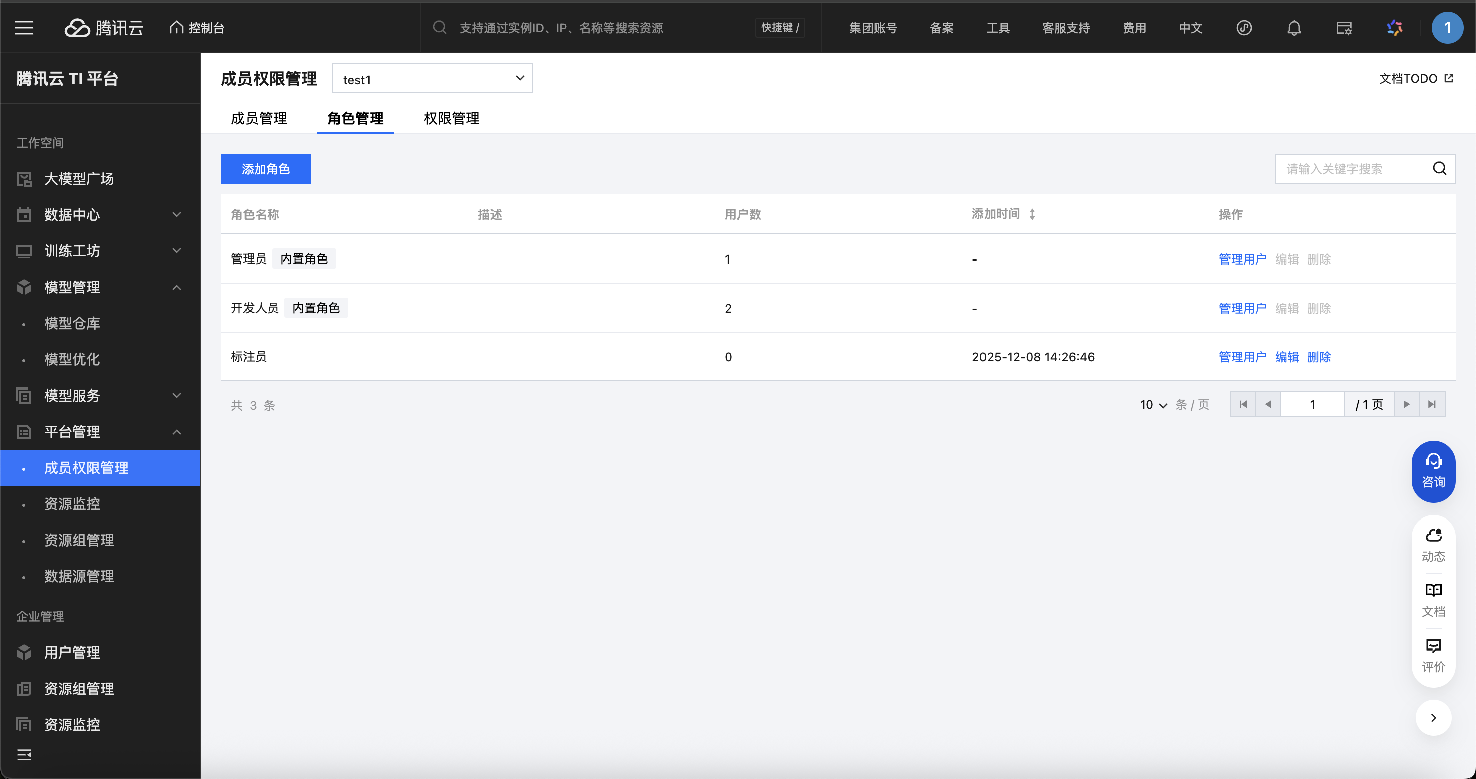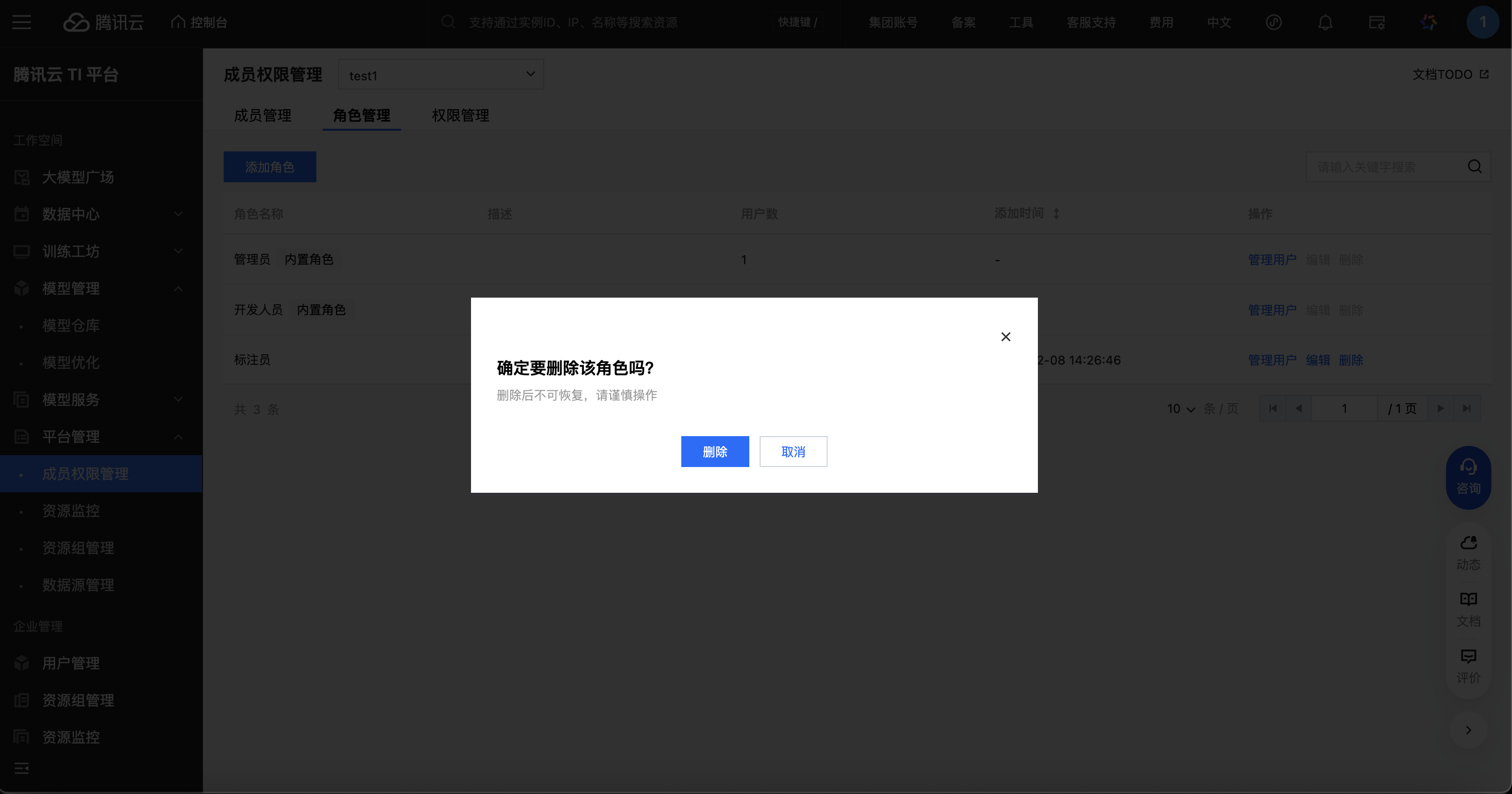 本文介绍工作空间内的平台管理下的成员权限管理,该功能用于管理工作空间内成员的功能权限和数据权限。阅读本篇文章之前,建议您先阅读 企业管理与工作空间概述 了解 TI-ONE 的“企业-工作空间”两级权限管理概念,并完成准备工作。