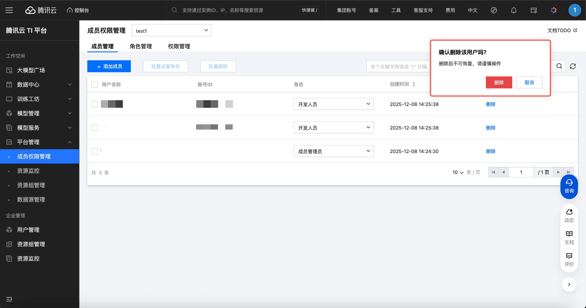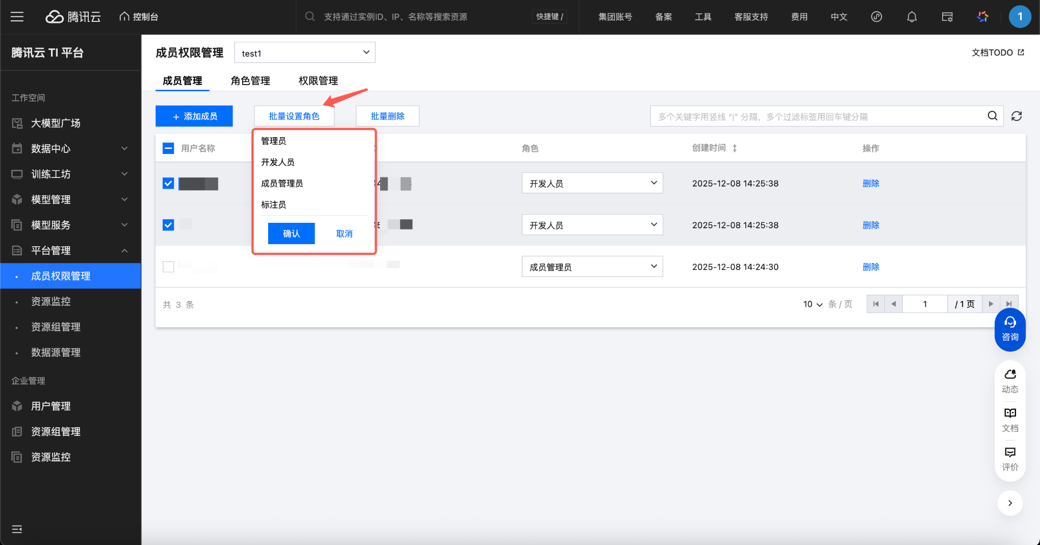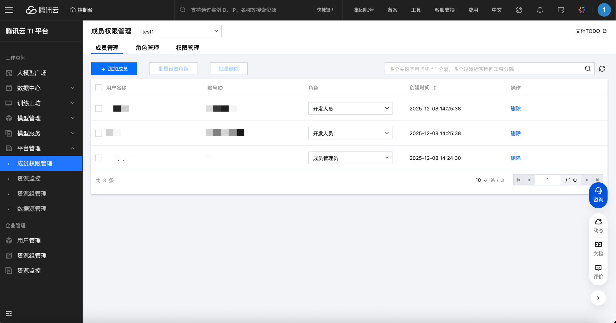 1. 在 TI-ONE 控制台 的平台管理>成员权限管理>成员管理中,单击添加成员。