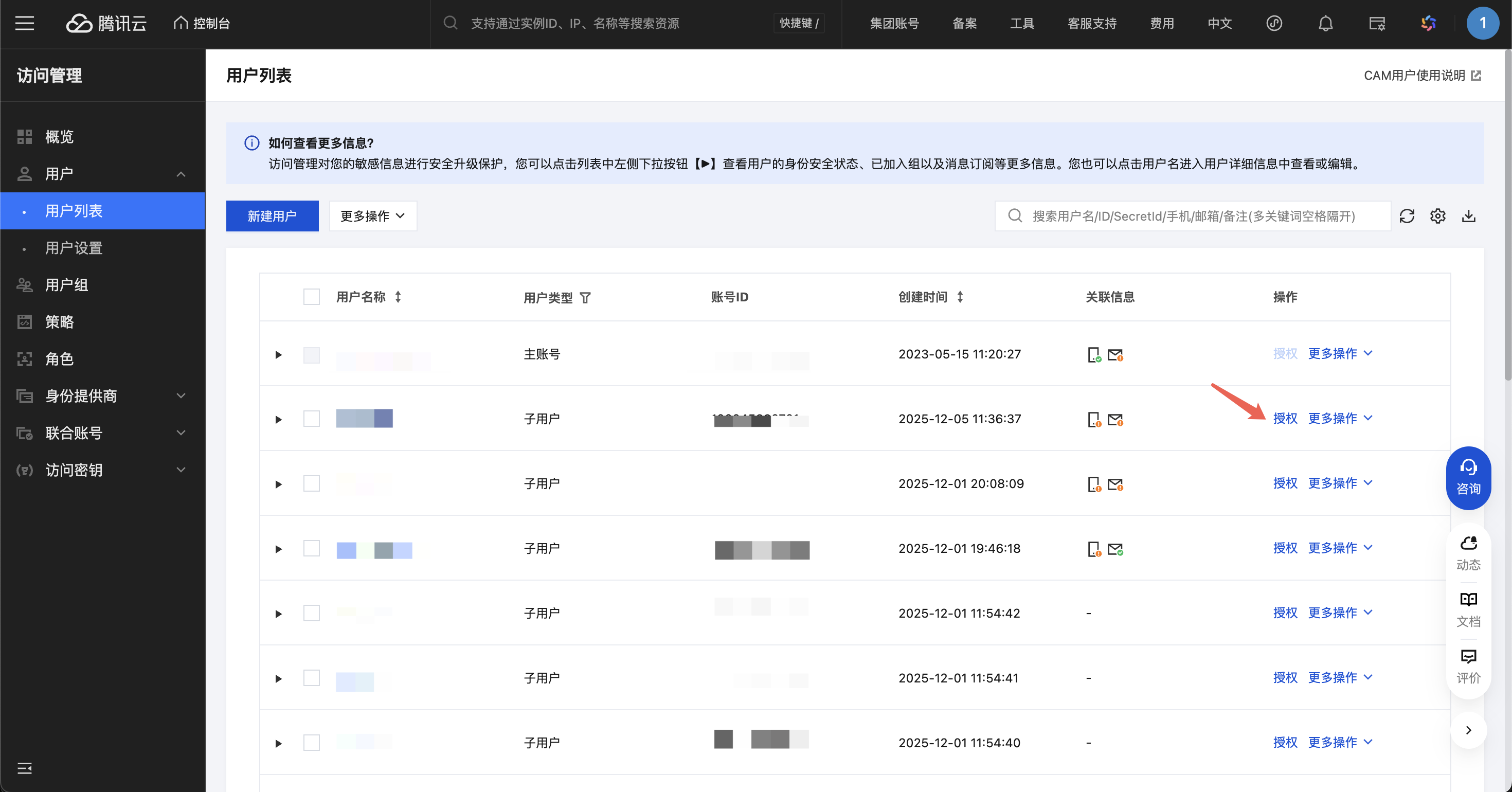 3. 为新建用户授权“QcloudTIONEFullAccessContainMultiservice”的预设策略。单击操作列的授权,选择该策略,单击确定完成授权。