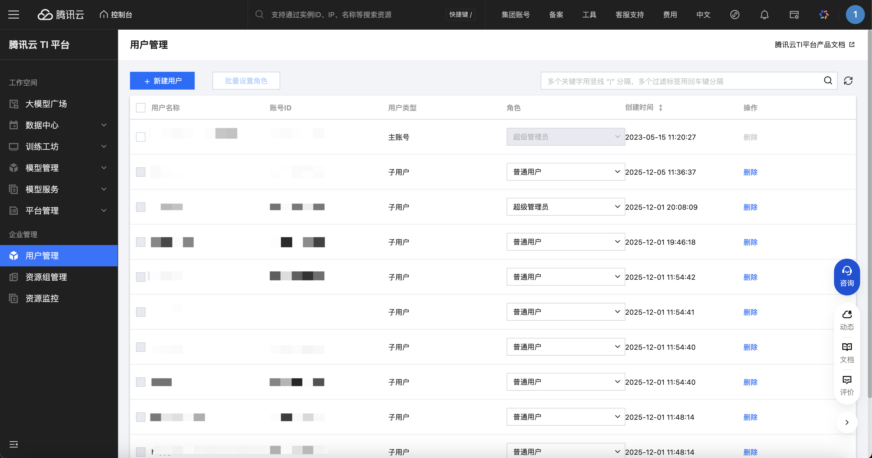 删除用户:删除企业内的子账号(主账号不可删除)。