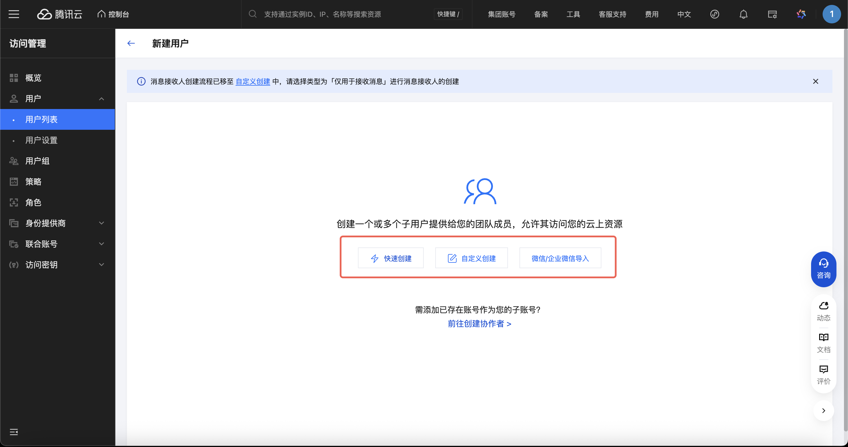 单击+新建用户,进入 腾讯云访问管理(CAM)中,创建腾讯云子账号。在此页面创建子账号后,需为其分配名称为“QcloudTIONEFullAccessContainMultiservice”的预设策略,该策略将授予其使用 TI-ONE 产品的基本权限。