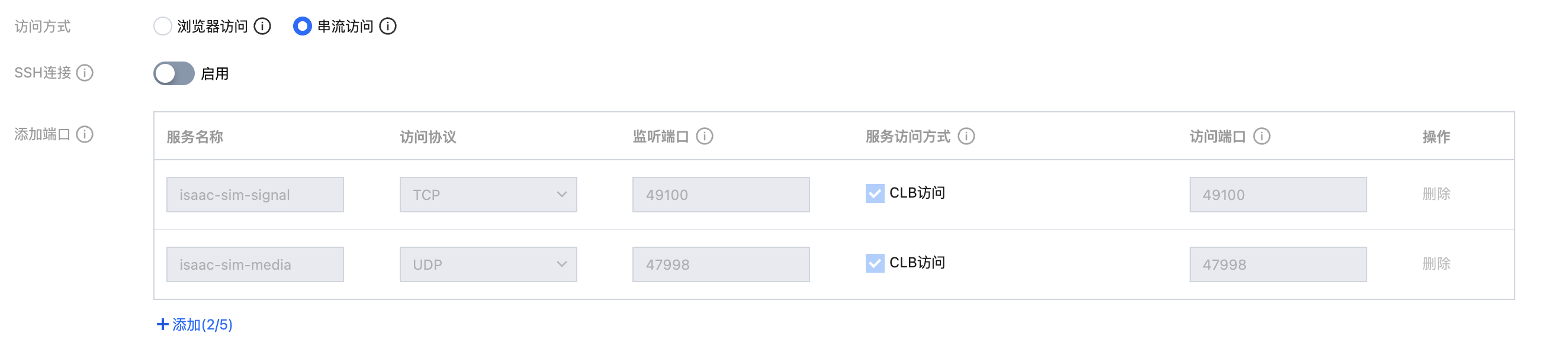 开启后若选择串流访问,则会默认展示两个自定义端口配置,如下图所示: